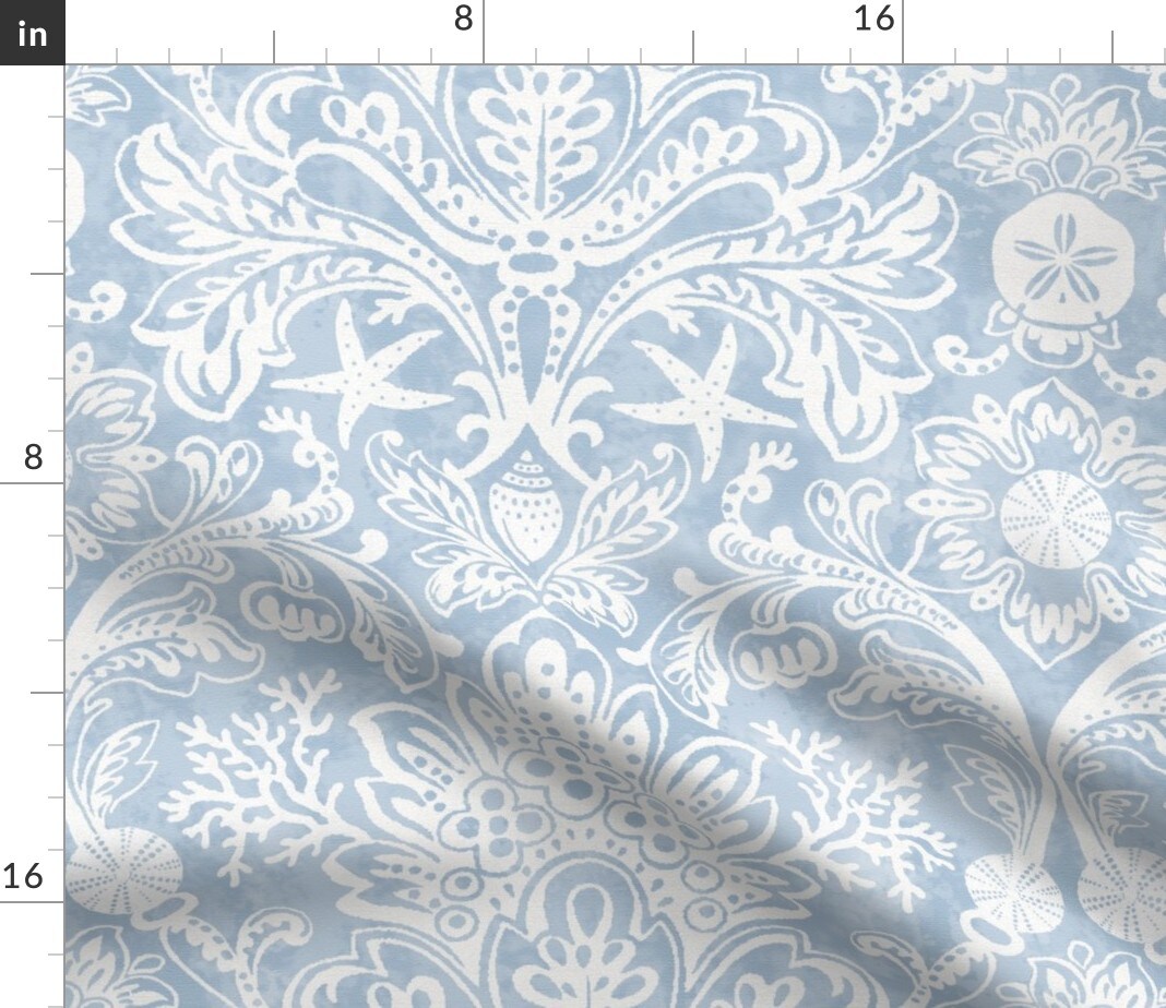 Blue Coastal Damask Seashells Beach Ocean Traditional Serene Botanical Custom Printed Fabric by Spoonflower Various Fabrics by the Yard or Fat Quarter