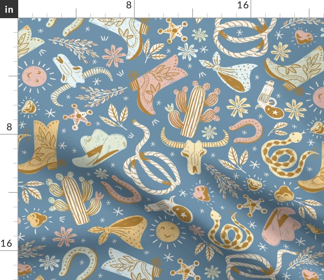 Blue Cowboy Pastel Rustic Country Western Style Down Home Cowgirl Custom Printed Fabric by Spoonflower Various Fabrics by the Yard or Fat Quarter