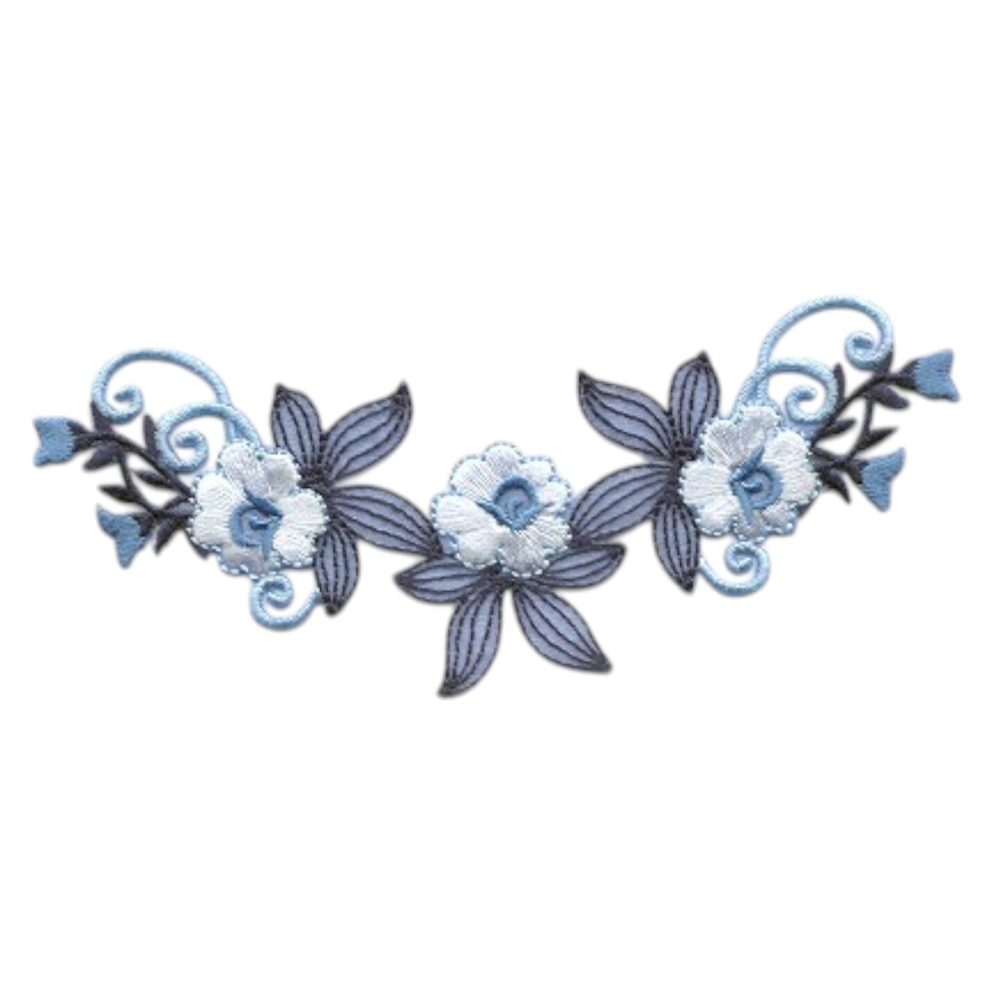 Blue Floral Embroidered Motif Applique for Garments, Iron-On, 5.38" x 2.38" - Iron on Patch