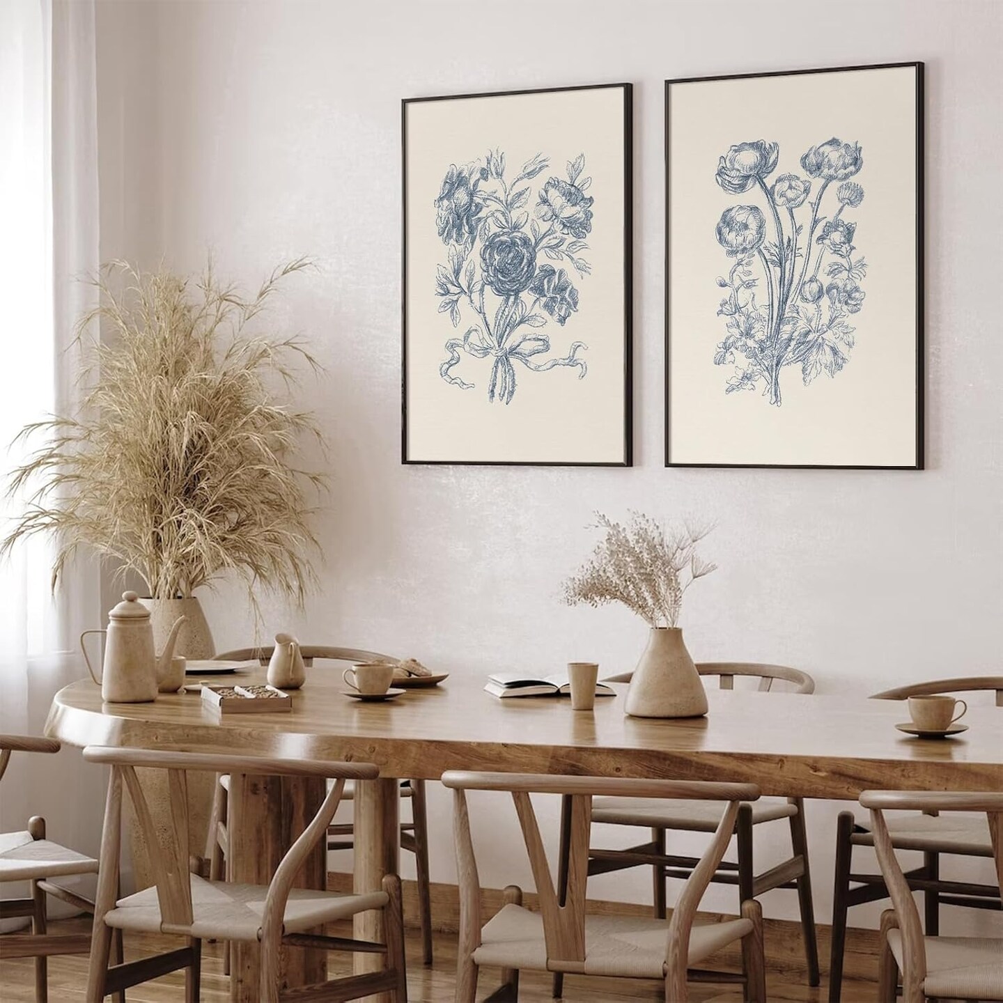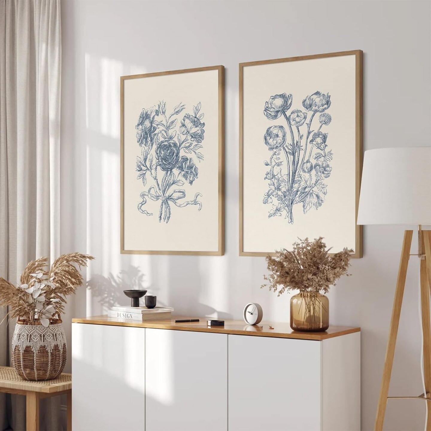 Blue Floral Wall Art Decor Vintage Flower Canvas,(12x16 Inch Unframed Set of 2)