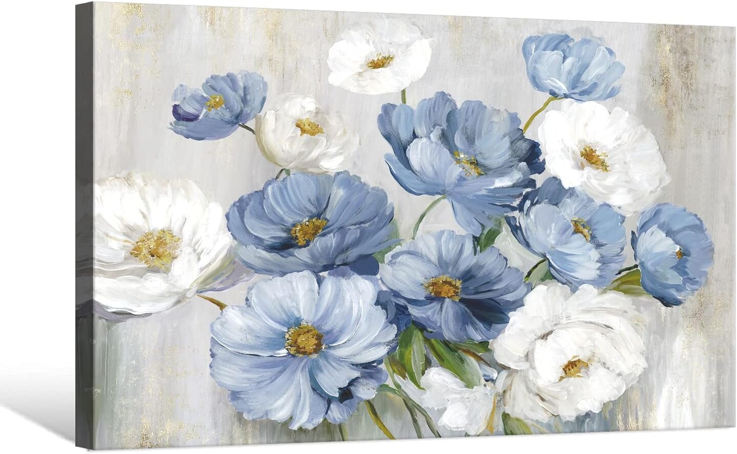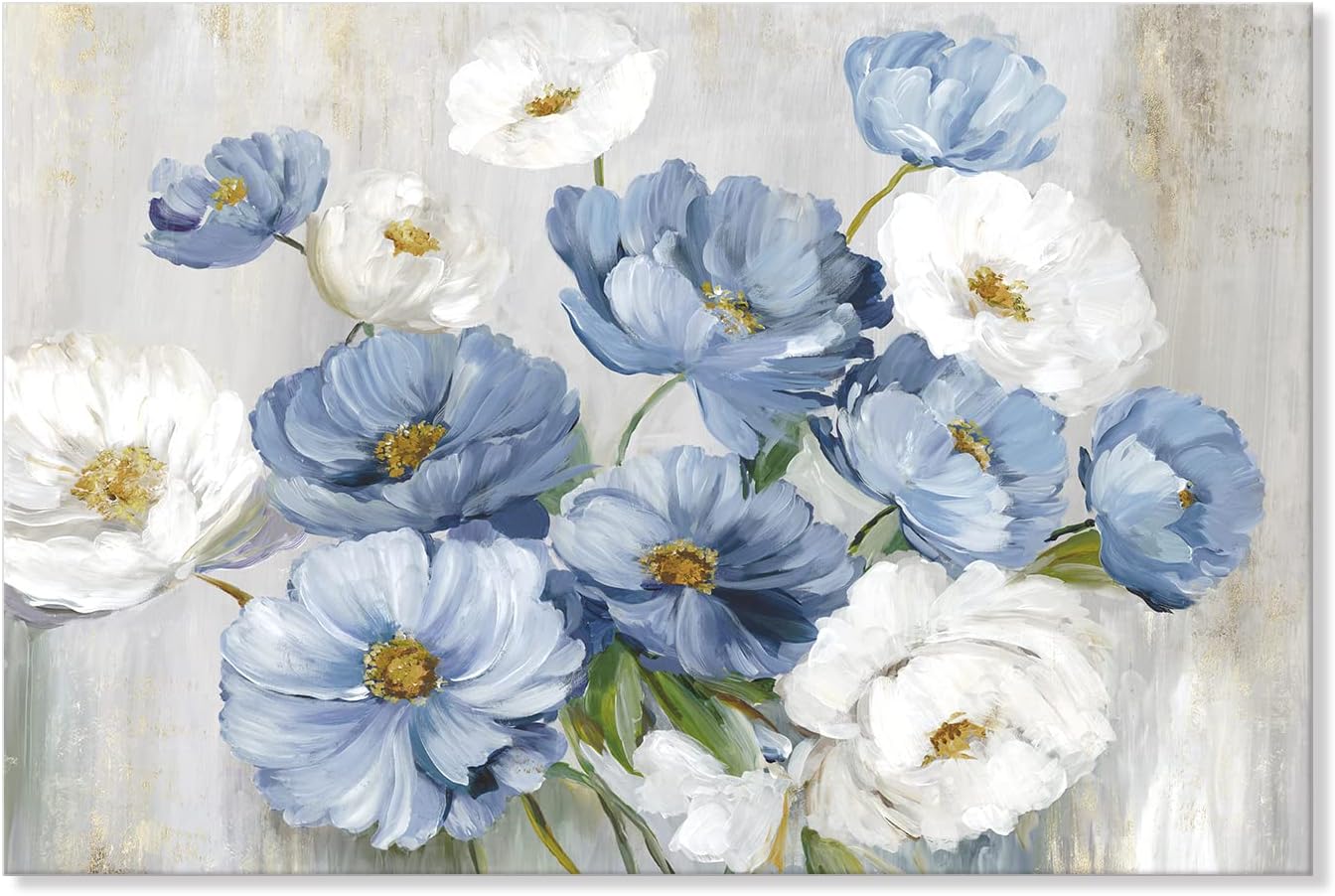 Blue Flower Picture Wall Decor White Floral Wall Art (36" x 24")