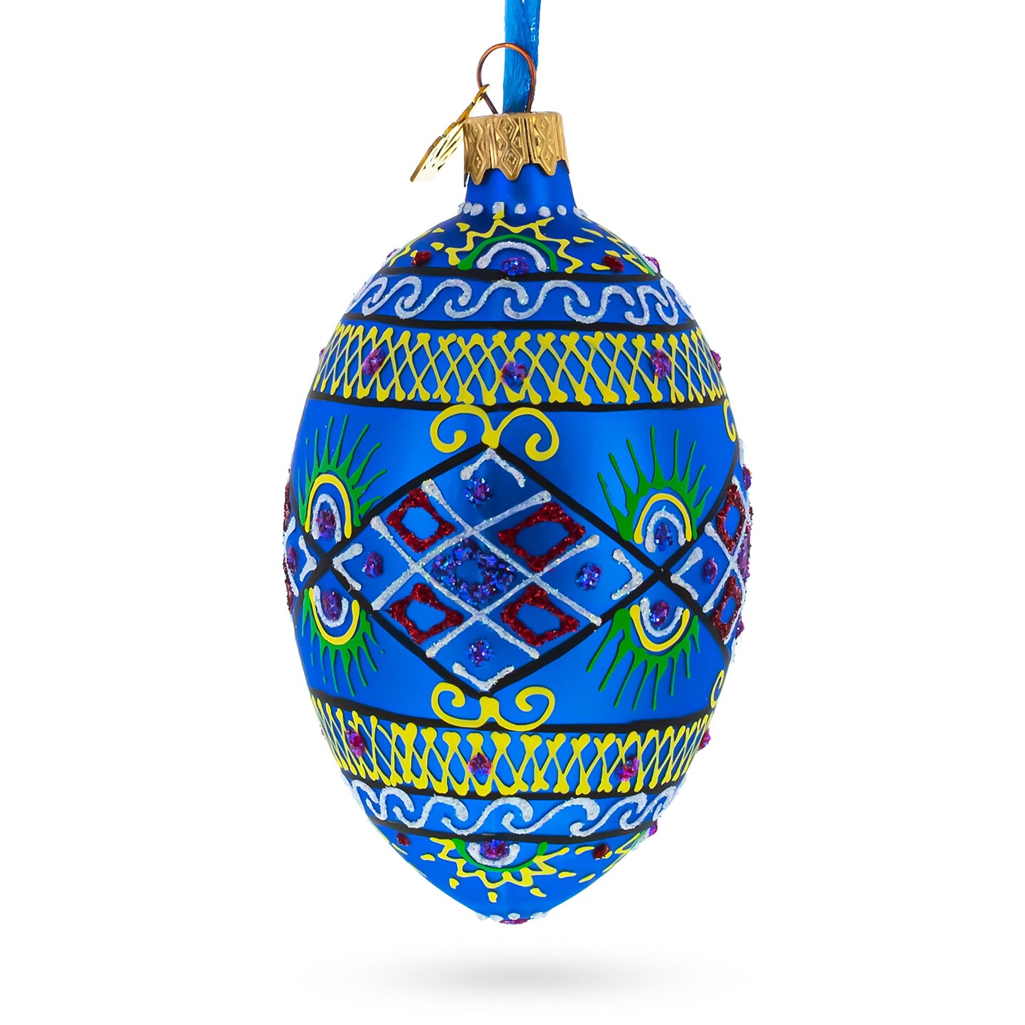 Blue Geometric Ukrainian Egg Glass Christmas Ornament 4 Inches