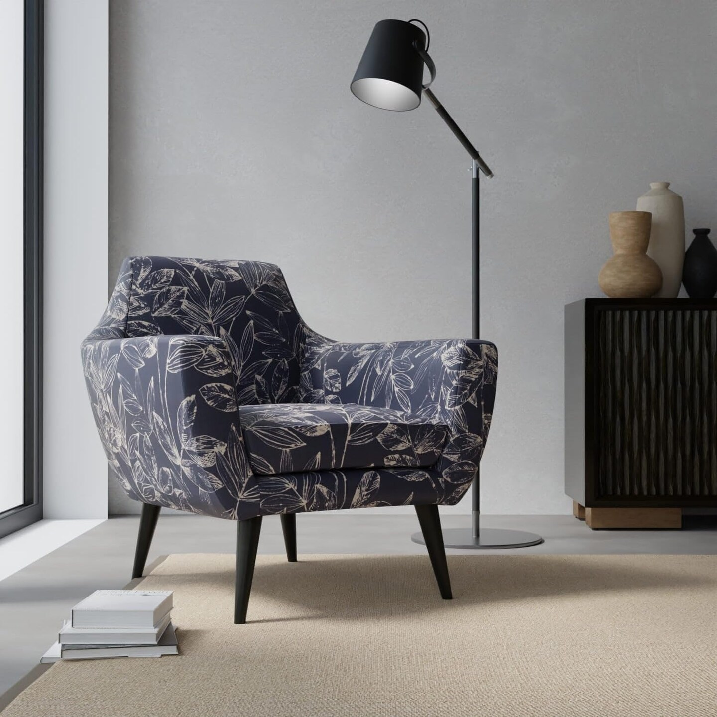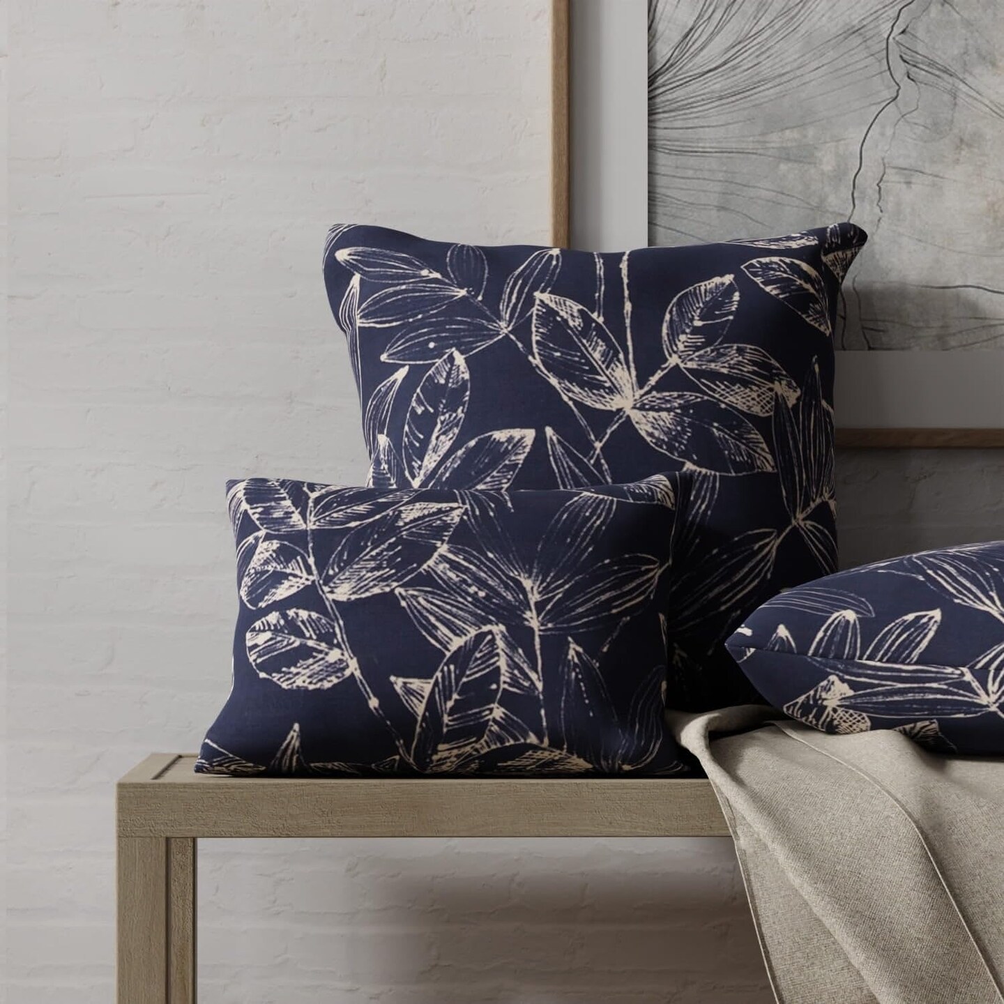 Blue Leaves Linen Look Print Upholstery Fabric by The Yard - SKU: Brady Midnight