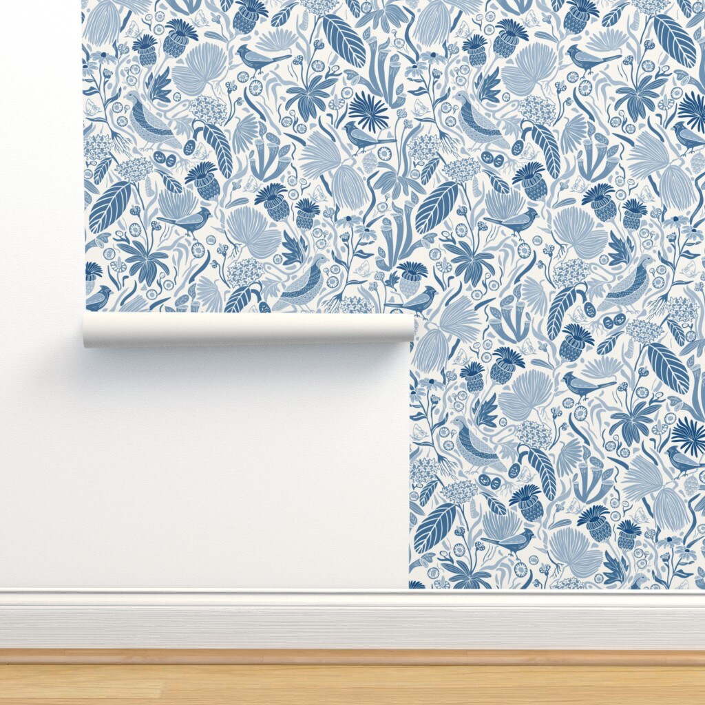 Blue Nature Birds Plant Cardinal Botanical Meadow Chintz Quail Southern Medium Scale Custom Pre-pasted Wallpaper by Spoonflower Pre-Pasted Wallpaper 2FT Wide