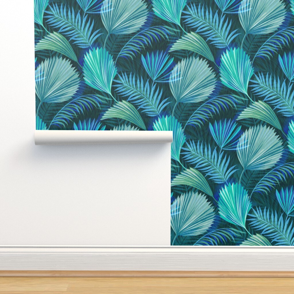 Blue Palm Tropical Foliage Rainforest Summer Electric Green Large Scale Custom Pre-pasted Wallpaper by Spoonflower Pre-Pasted Wallpaper 2FT Wide
