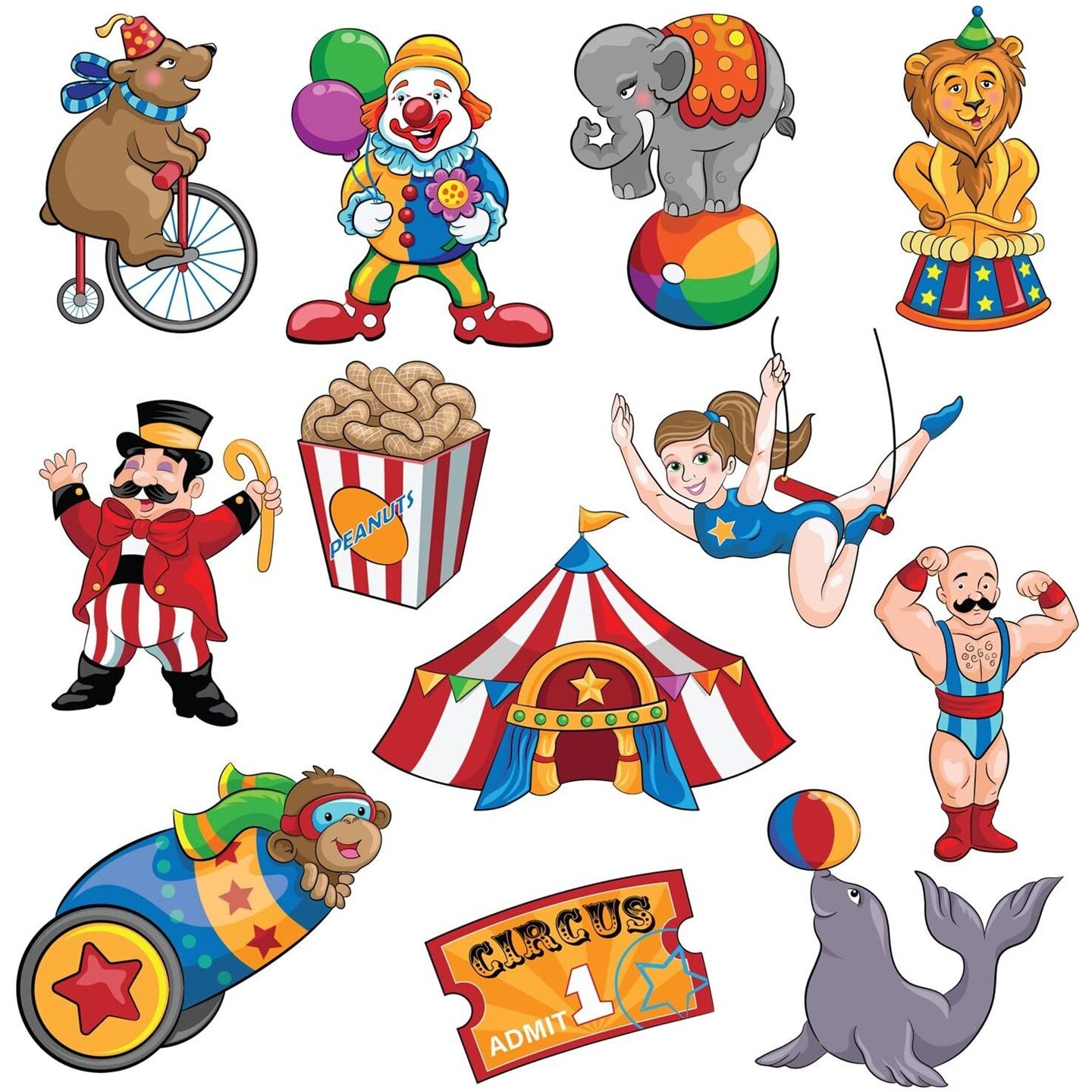 Blue Panda Carnival Cutouts Party Supplies - 12-Piece Circus Theme Birthday Party Favors Animals, Clown Performers, Colorful Print Design Decoration on 350 GSM Paper