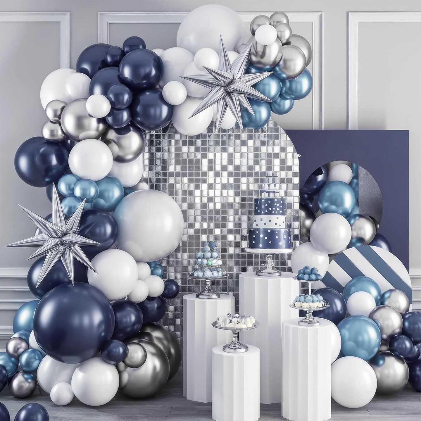Blue Silver Balloon Arch Kit, Navy Blue Silver White Balloon Garland with Metallic Light Blue Silver Balloons Star Foil Balloons for Boys Men Birthday Wedding Graduation Baby Shower Party Decoration