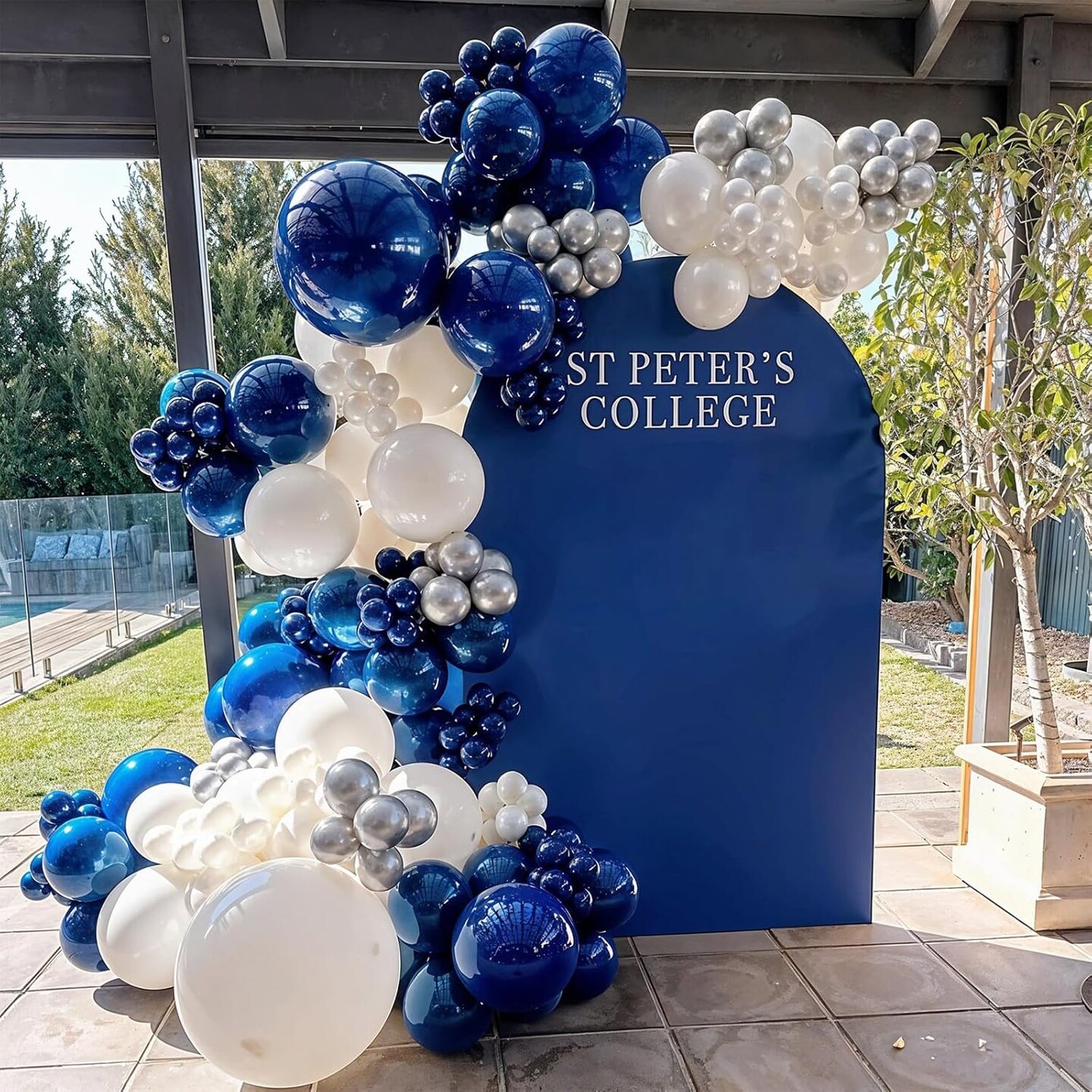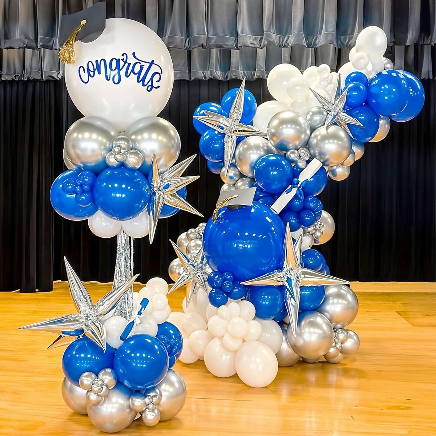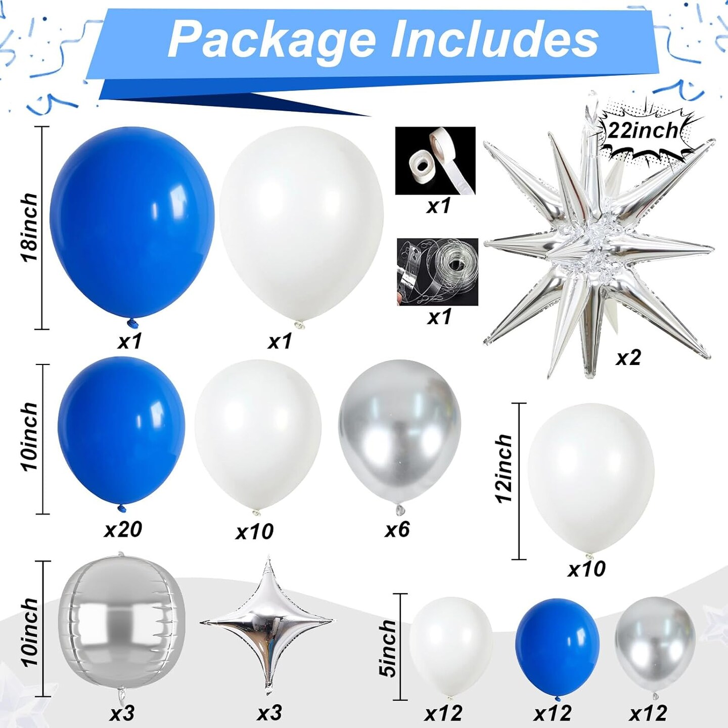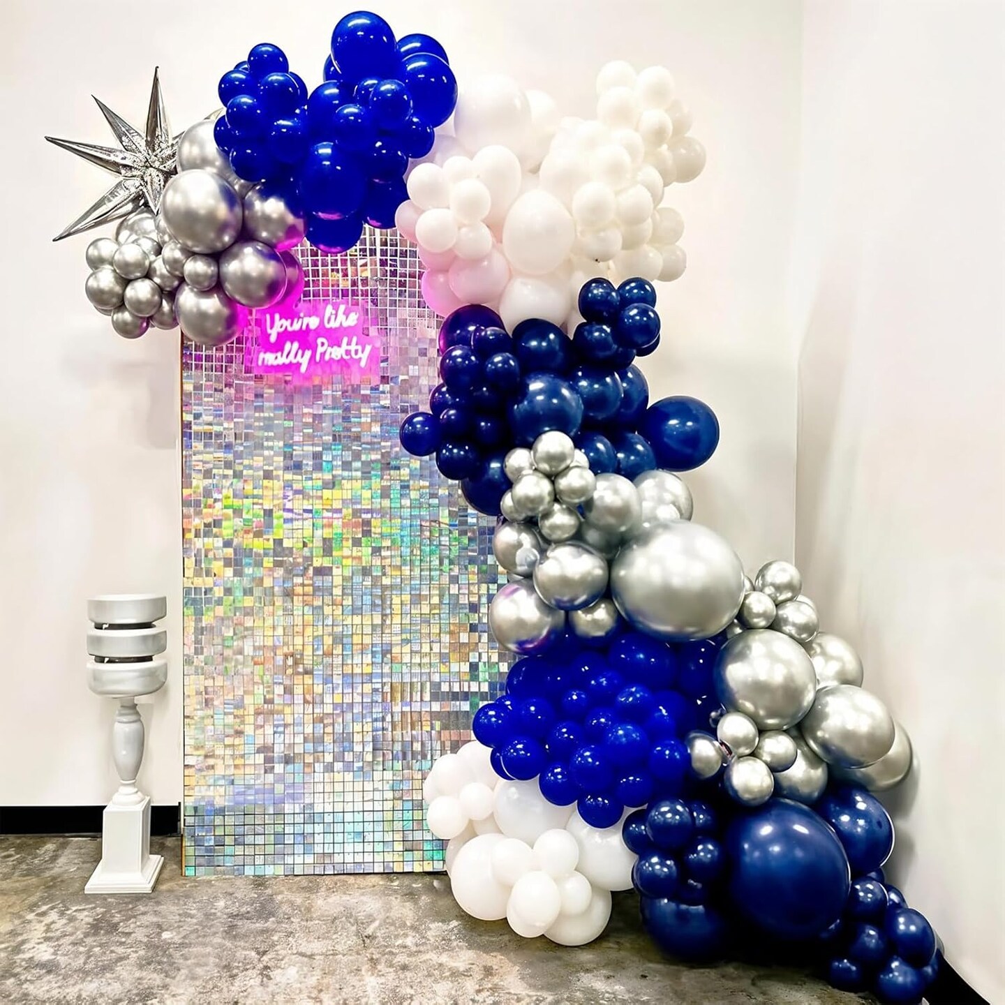 Blue White Silver Balloon Arch Kit with Explosion Star 4D Silver Foil Balloons Royal Blue Metallic Silver White Balloon Garland