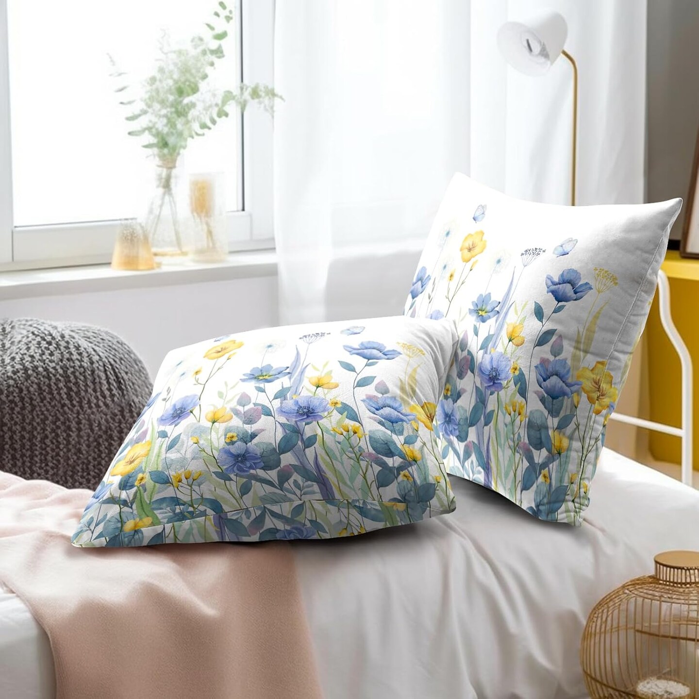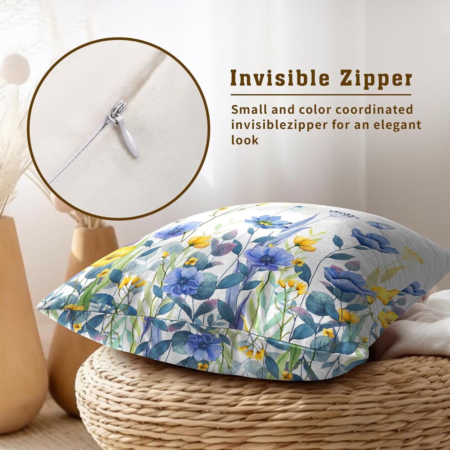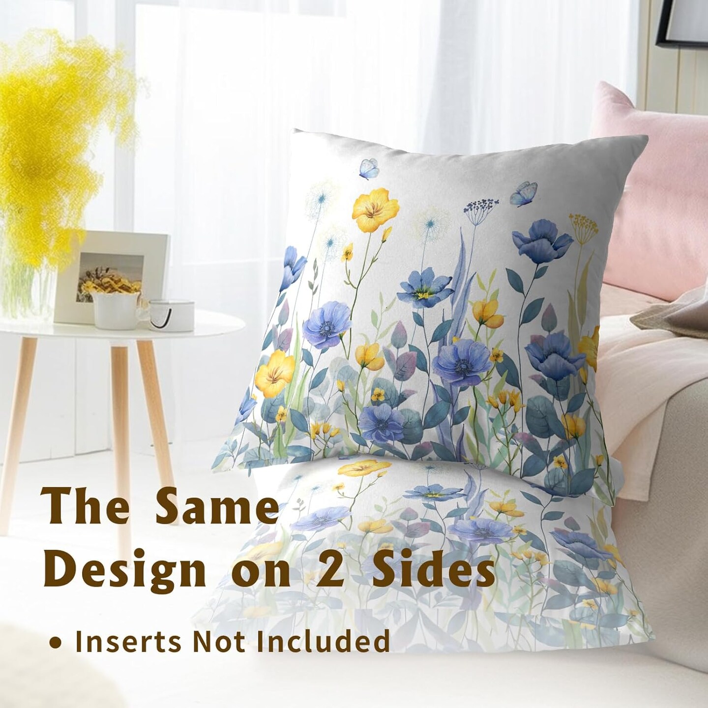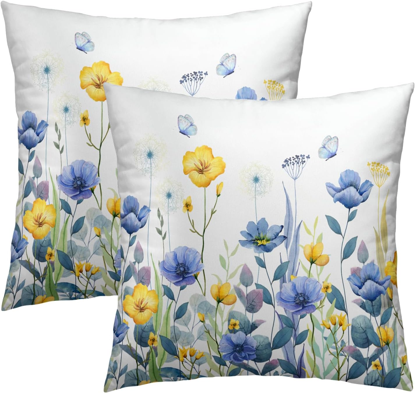 Blue Yellow Flowers Pillow Covers 18x18 Inch Set of 2, Poppy Floral Square Cushion Covers Spring Summer Seasonal Decor Pillowcase for Living Room Sofa Bedroom