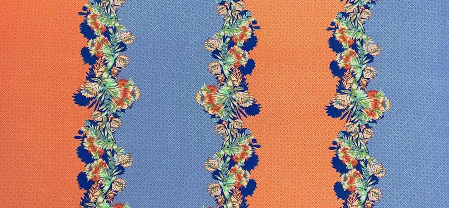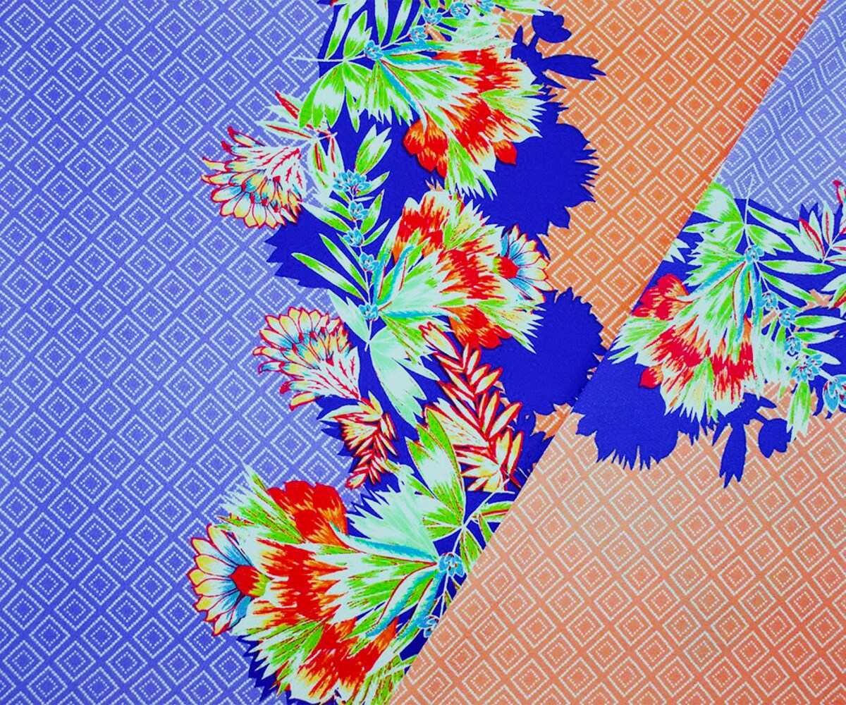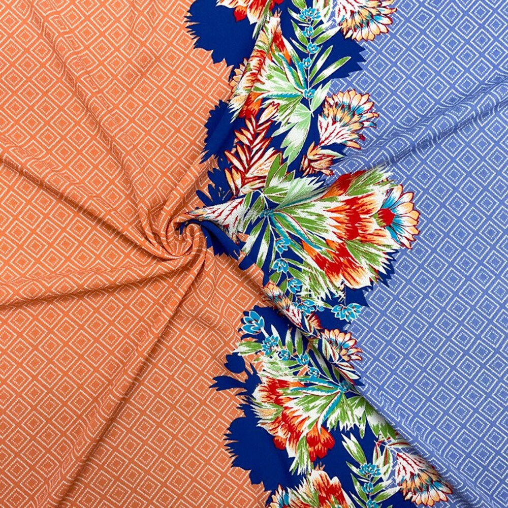Blue-Coral-Multi Poly Border Floral Diamond Printed Crepe Woven Fabric By the Yard