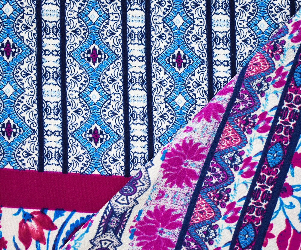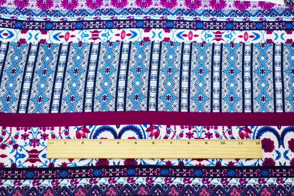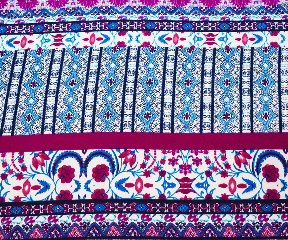 Blue-Fuchsia-Teal Poly Boho Multi Border Pattern Print Pebble Crepe Fabric By the Yard