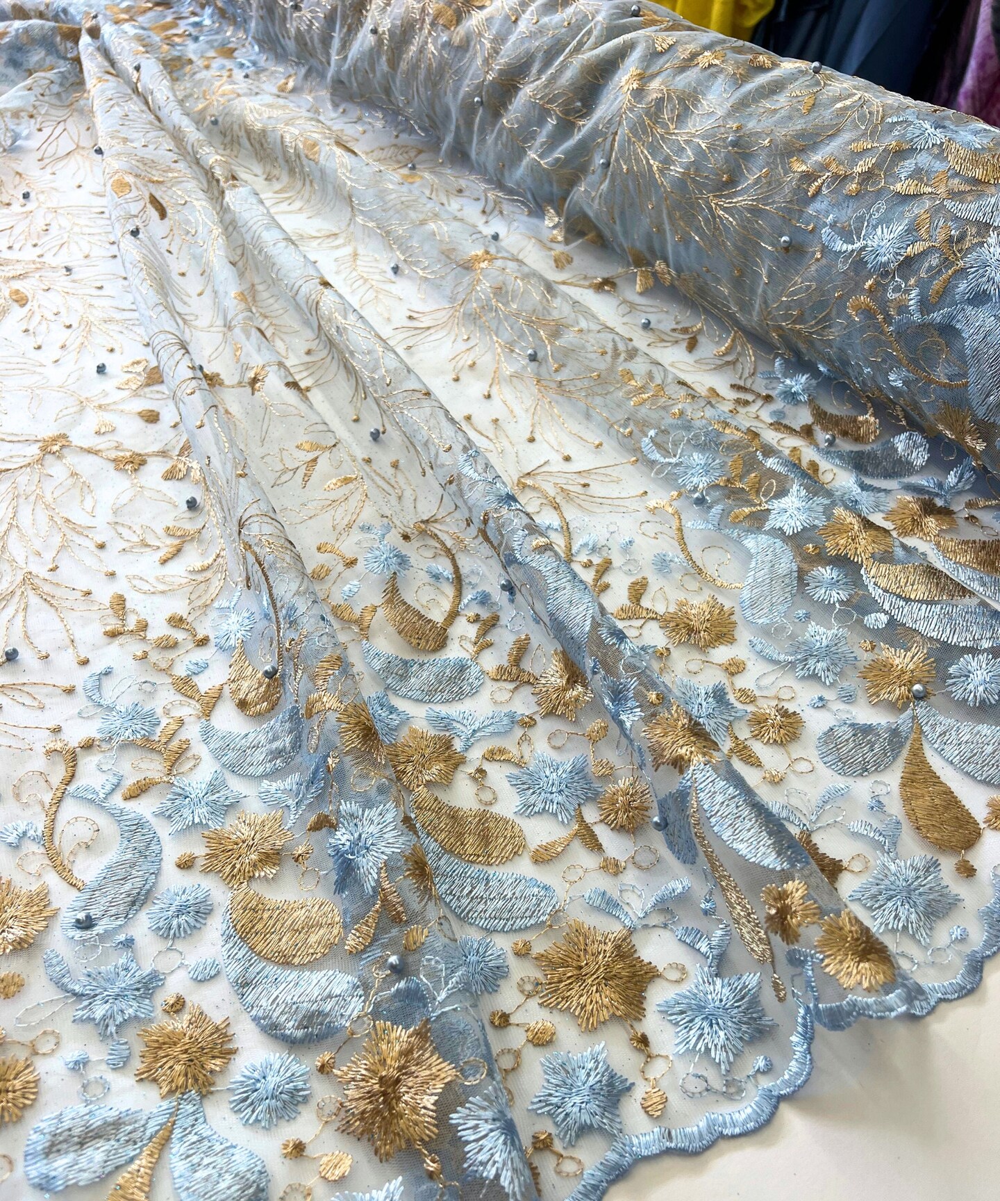 Blue/Gold Sequin Embroidered Lace Fabric by the Yard, 54" Wide Floral Mesh Lace with Double Scalloped Edges