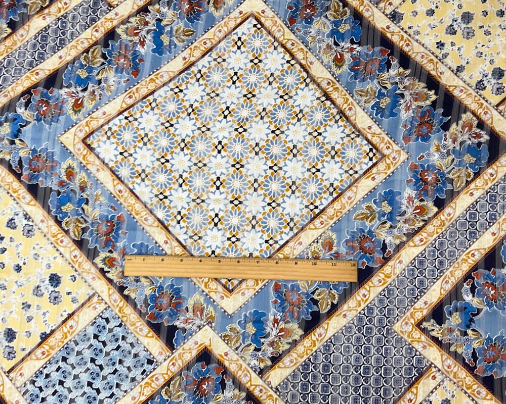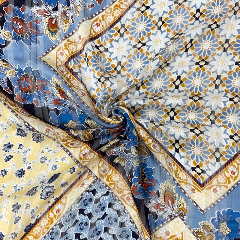 Blue-Multi Poly Floral Printed Satin Stripe Chiffon Woven Fabric By the Yard