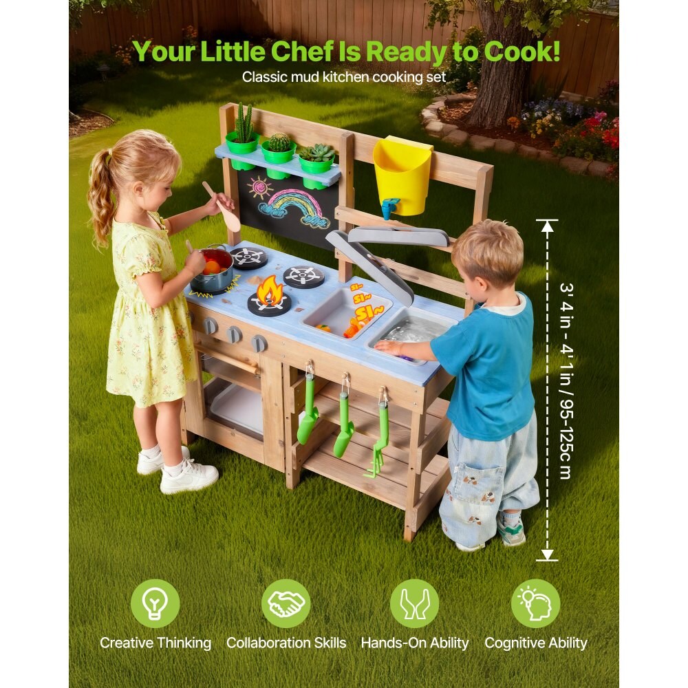 Blue-Natural Fir Wood Kids Mud Kitchen 4-Stove Outdoor Playset