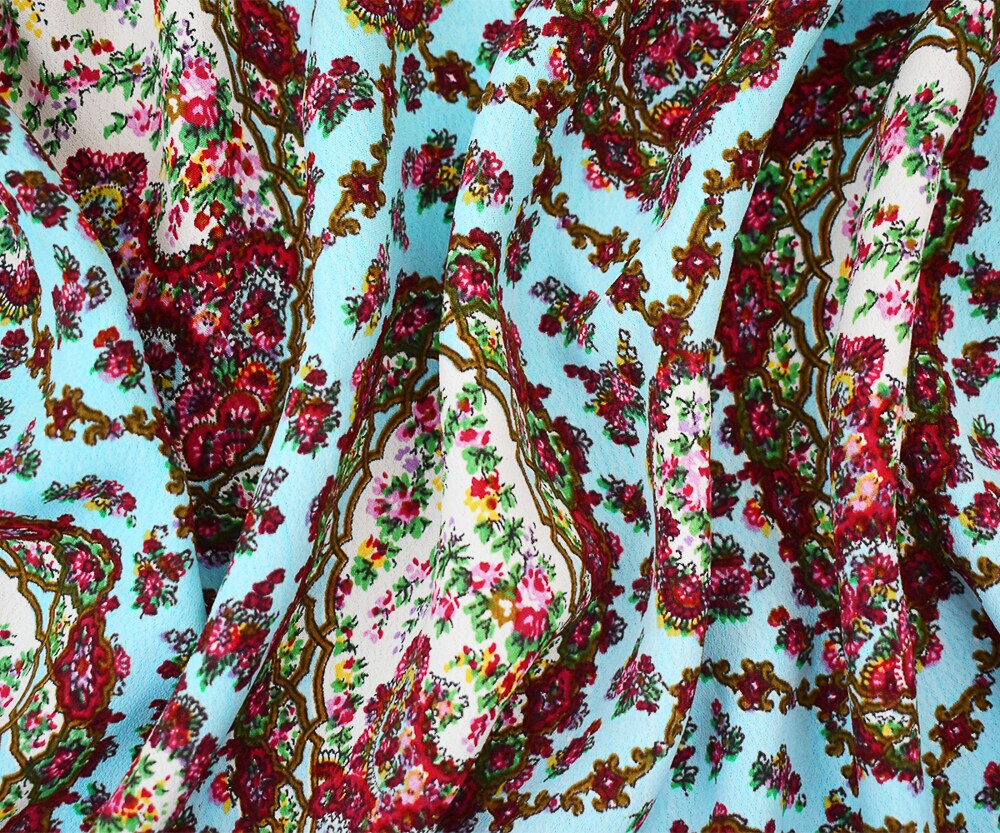 Blue-Red-Multi Floral Frame Trellis Printed Rayon Crepe Faille Fabric By the Yard