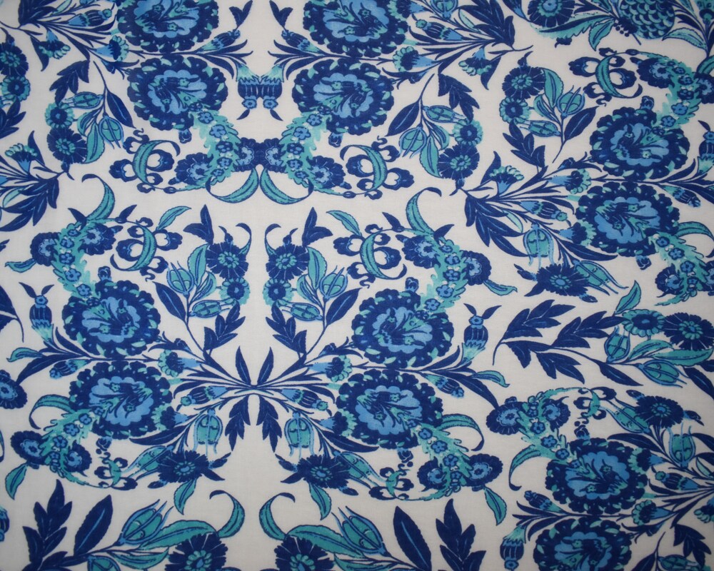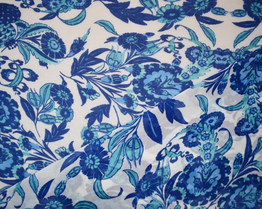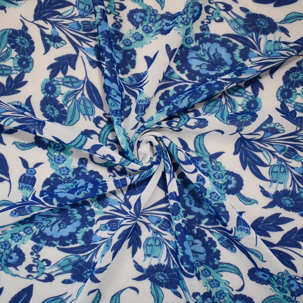 Blue-White-Multi Poly Floral Paisley Border Print Chiffon Woven Fabric By the Yard