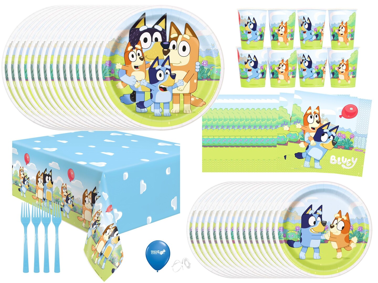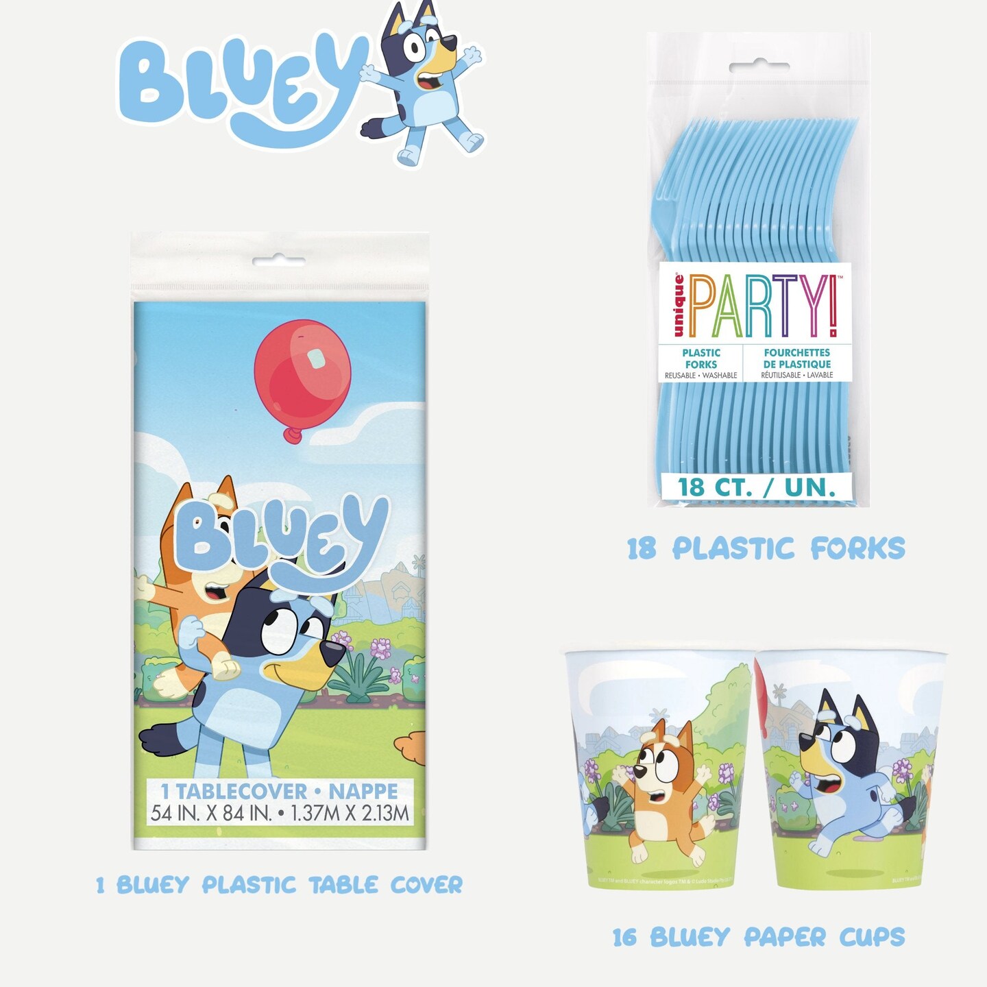 Bluey Birthday Party Supplies Bundle with Bluey Dinner Plates & Cake Plates, Bluey Napkins, Bluey Table Cover, Bluey Cups, and Forks - Serves 16