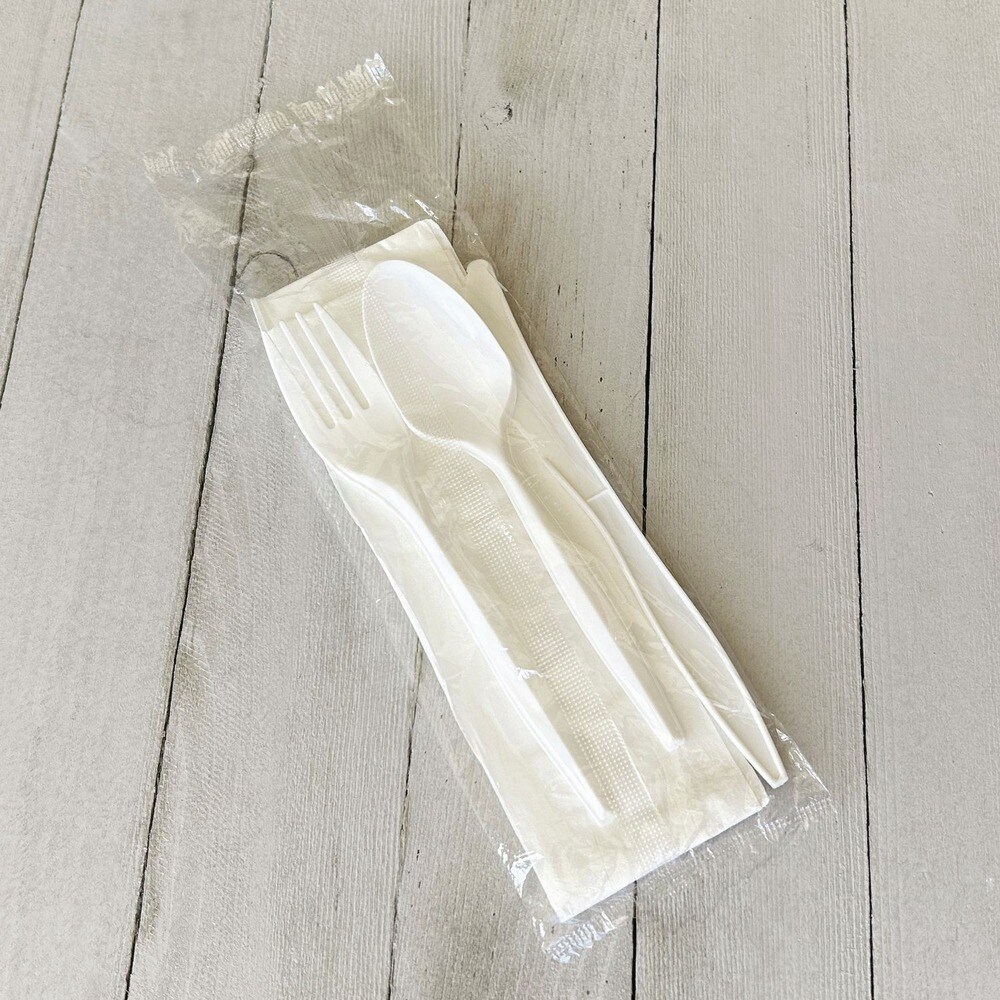Boardwalk 4-Piece Mediumweight Polypropylene Plastic Fork/Knife/Napkin/Spoon Cutlery Kit - White (250/Carton)