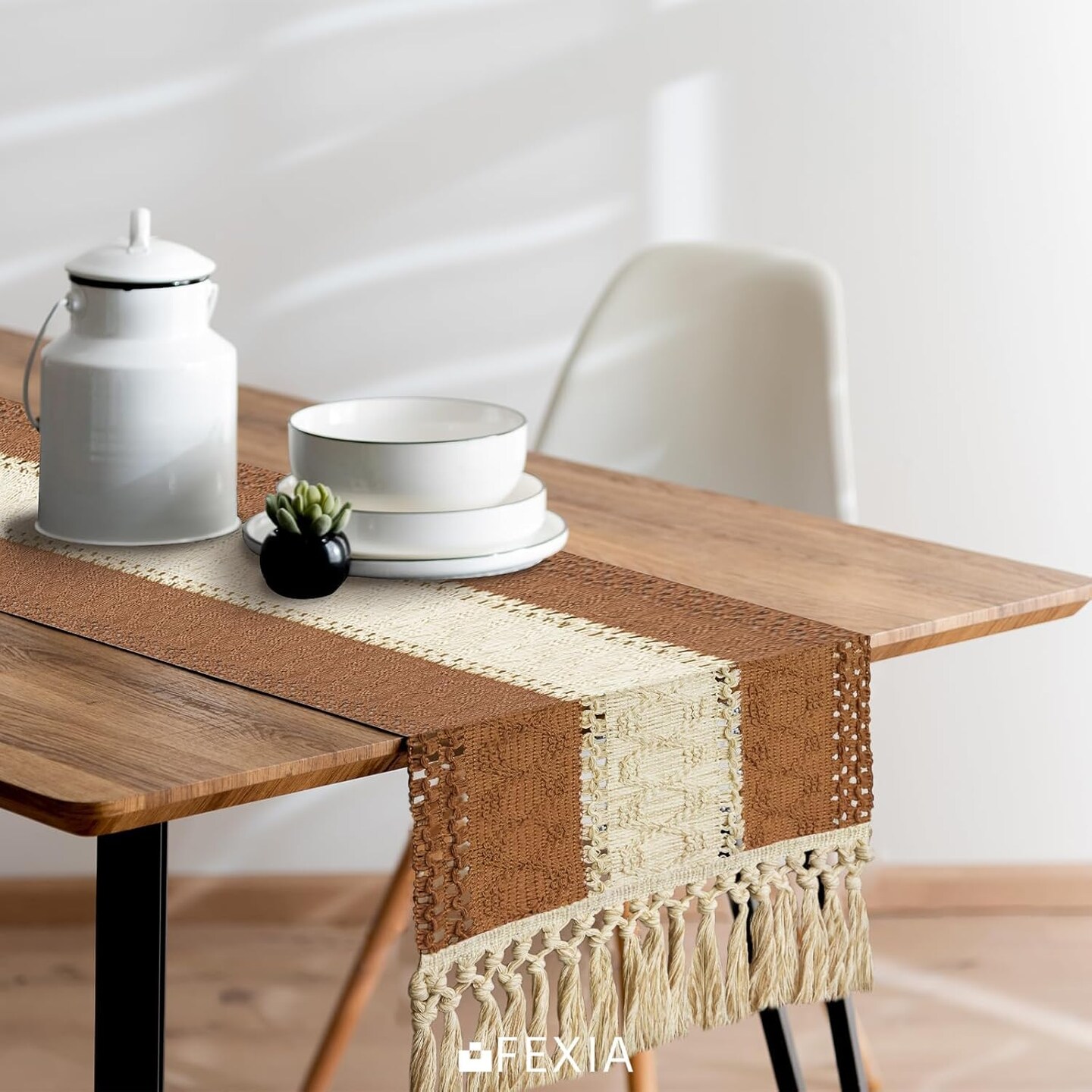 Boho Macrame Table Runner Rustic Caramel & Beige (12x72 Inches)