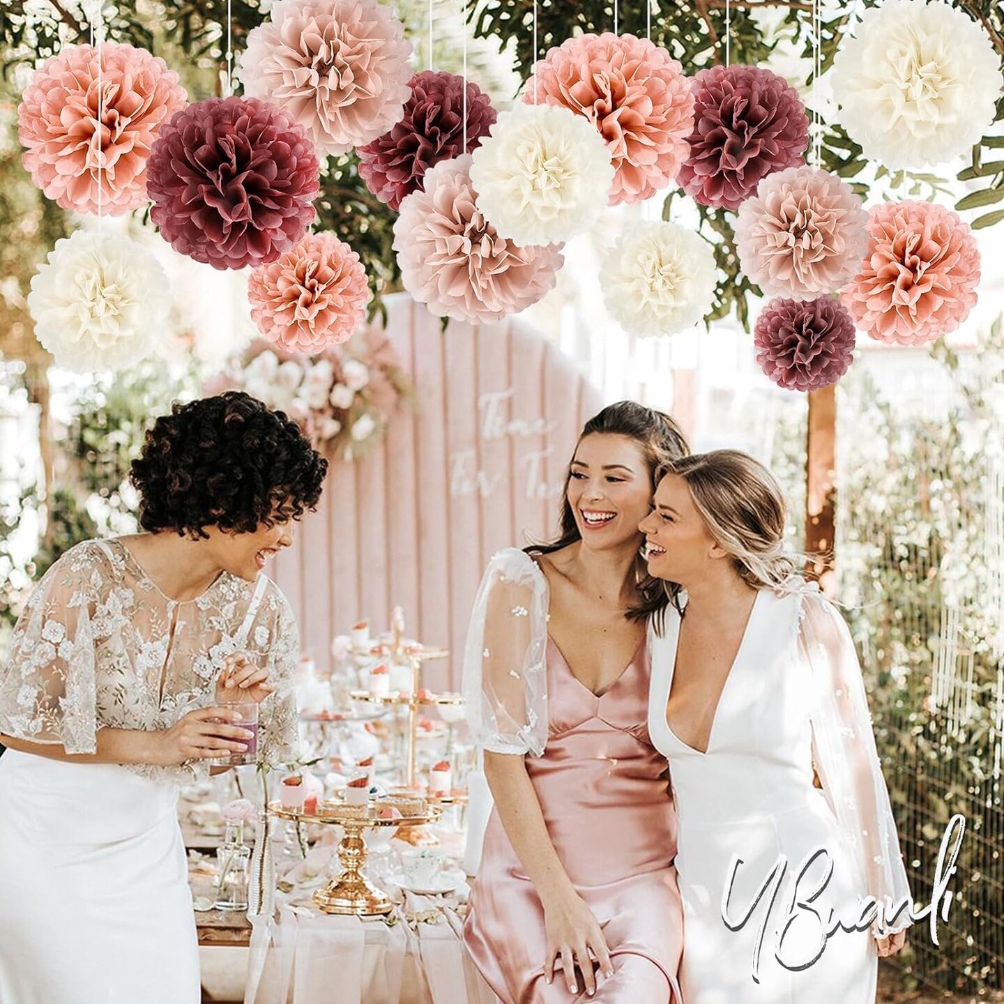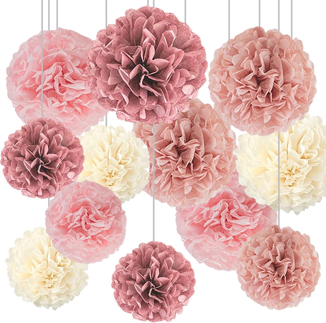 Boho Party Decoration,12pcs Blush Pink, Dusty Rose, Mauve, Cream Tissue Paper Pom Poms,Hanging Paper Flowers for Wedding Bridal Shower Bachelorette Party Decoration