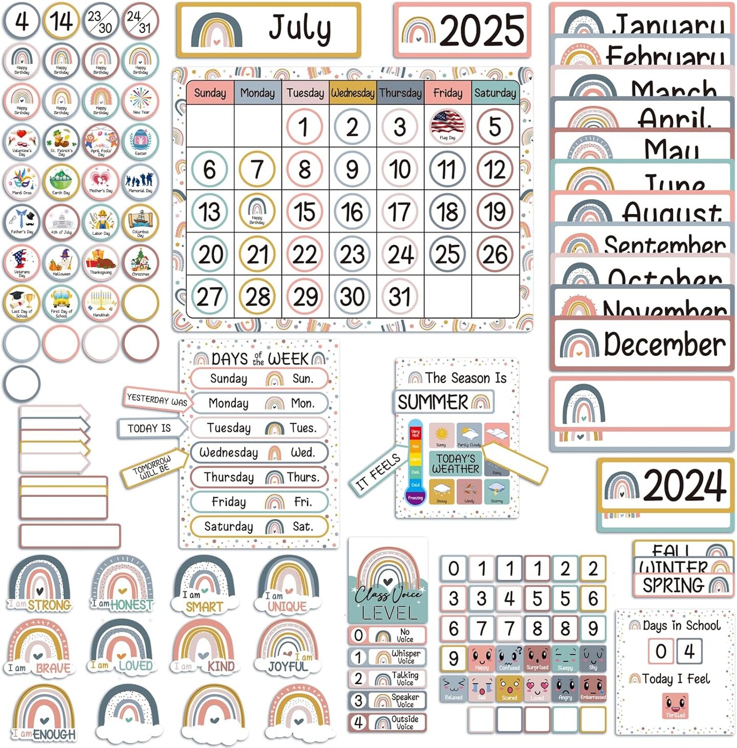 Boho Rainbow Calendar Bulletin Board Set with Seasons
