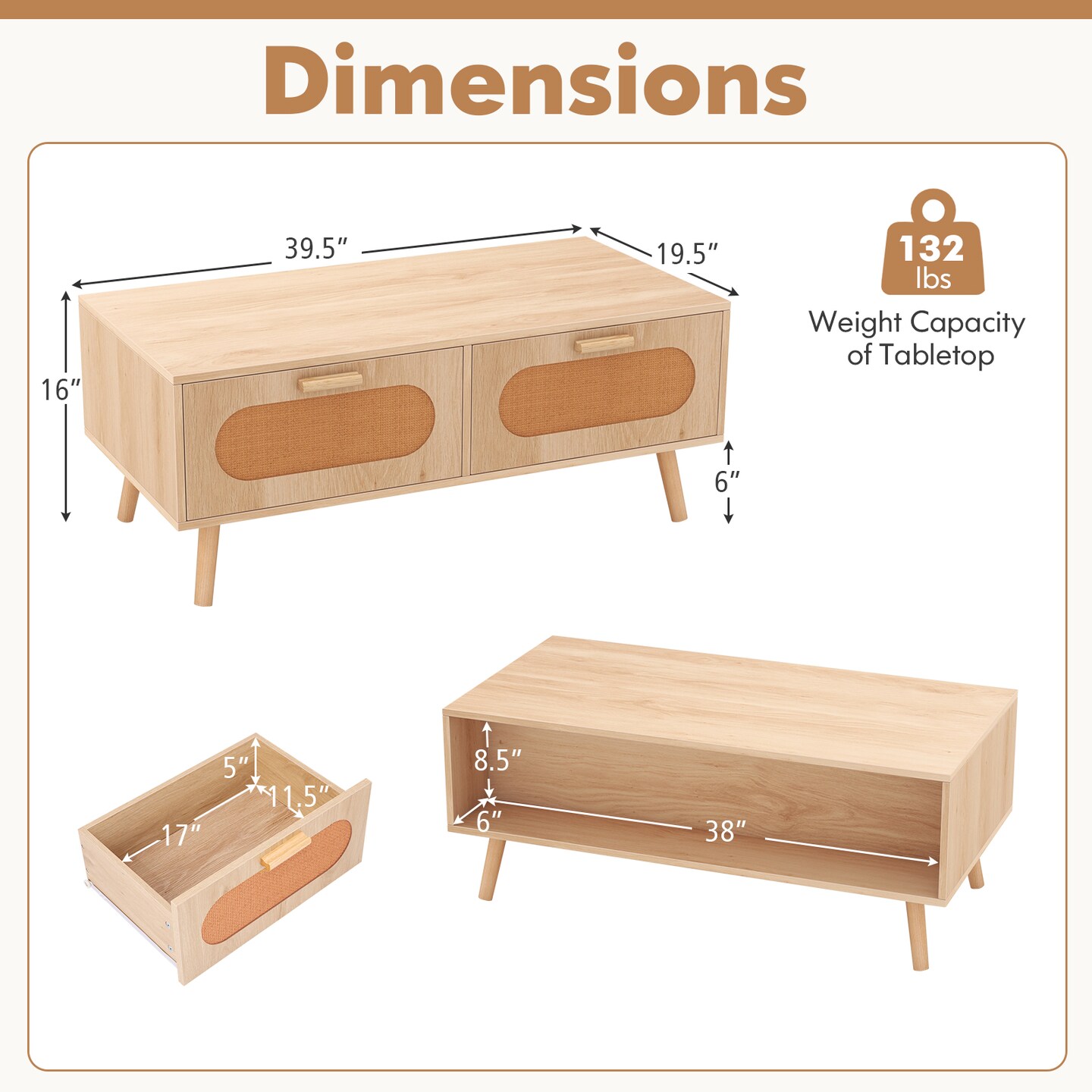 Boho Rattan Coffee Table with Storage Drawers & Open Shelf, Solid Wood Legs