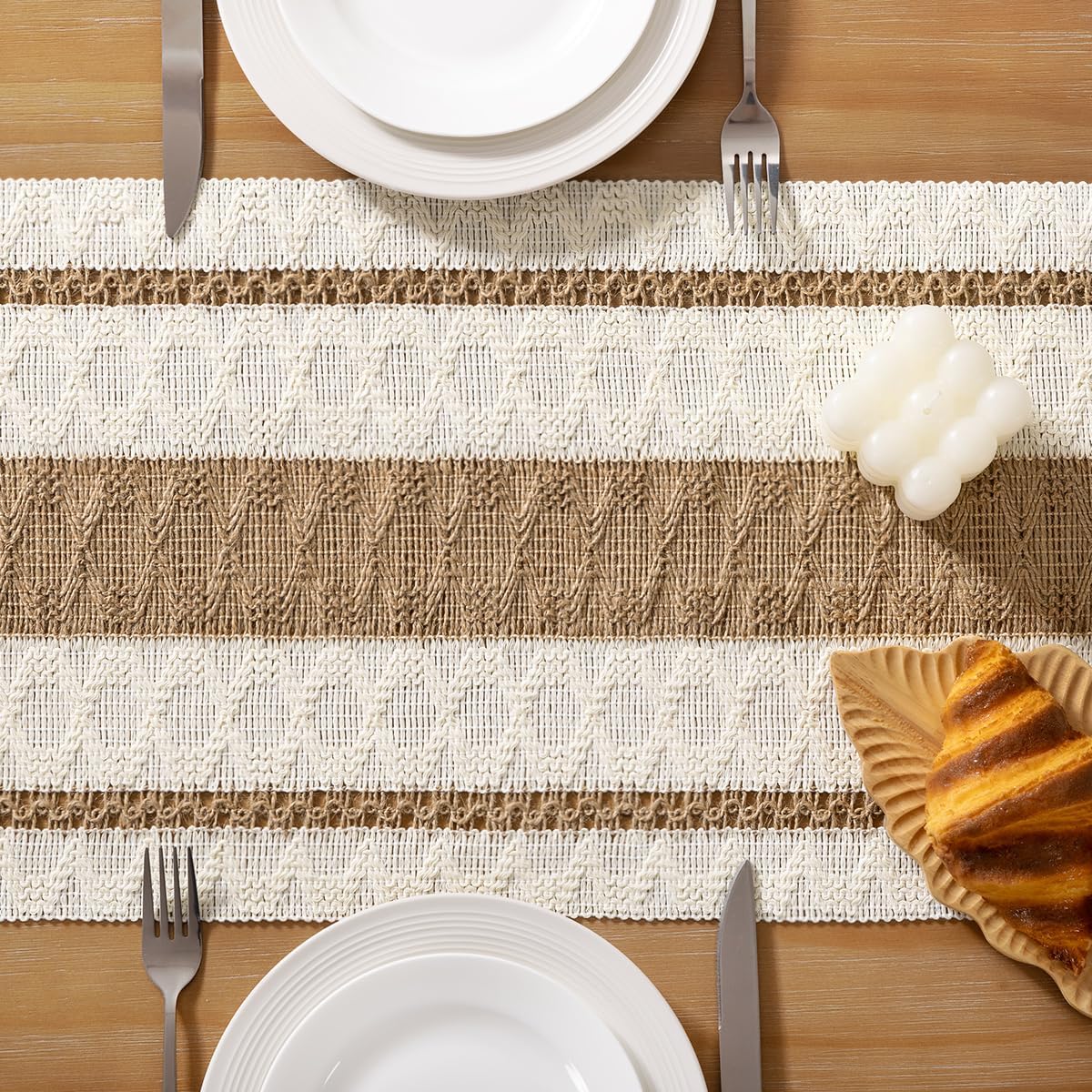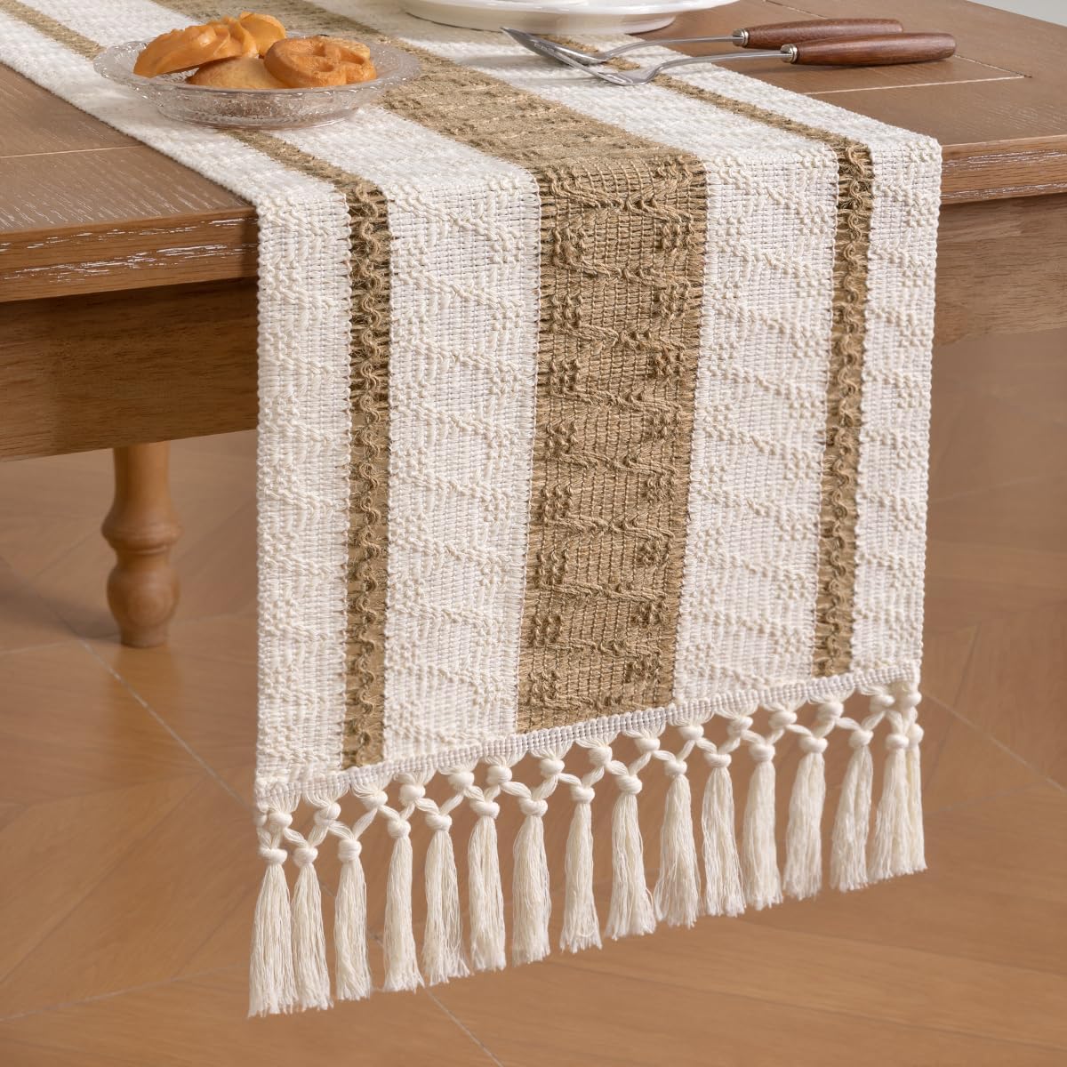 Boho Table Runner – Fall Thanksgiving Farmhouse Rustic, Macrame Woven Cotton Linen (Brown & Ivory) 12x48 Inch