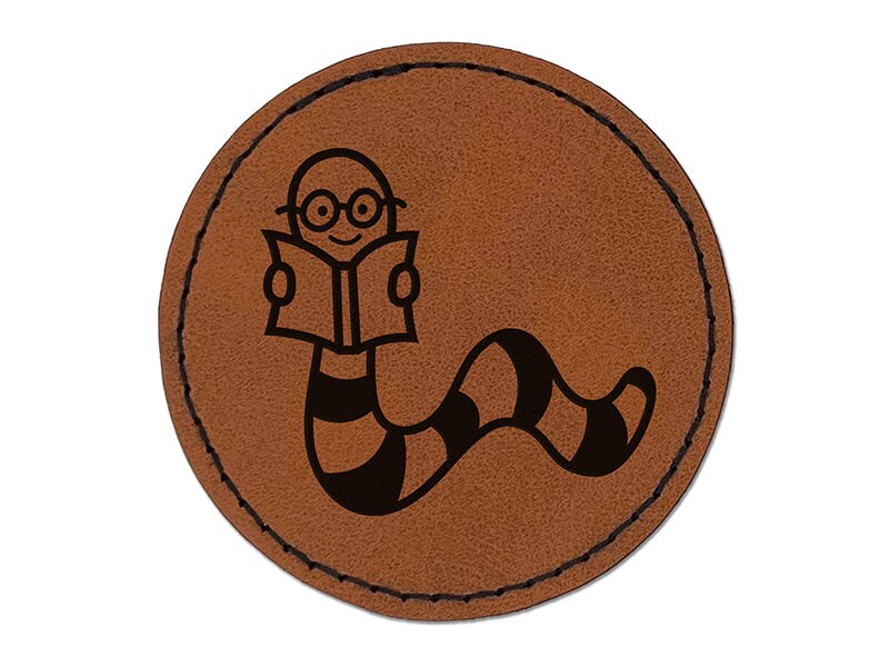 Book Worm Reading Round Iron-On Engraved Faux Leather Patch Applique - 2.5"
