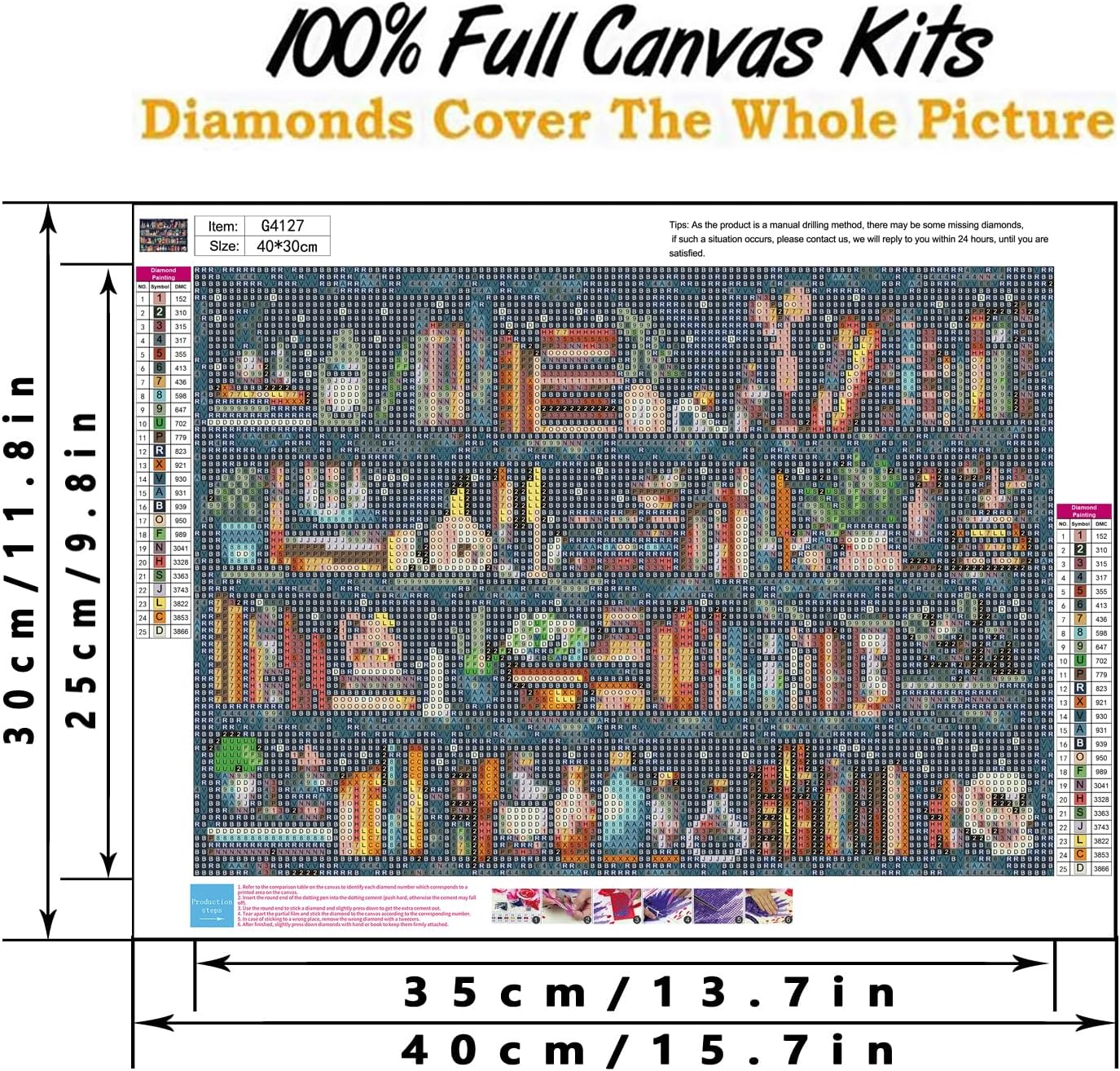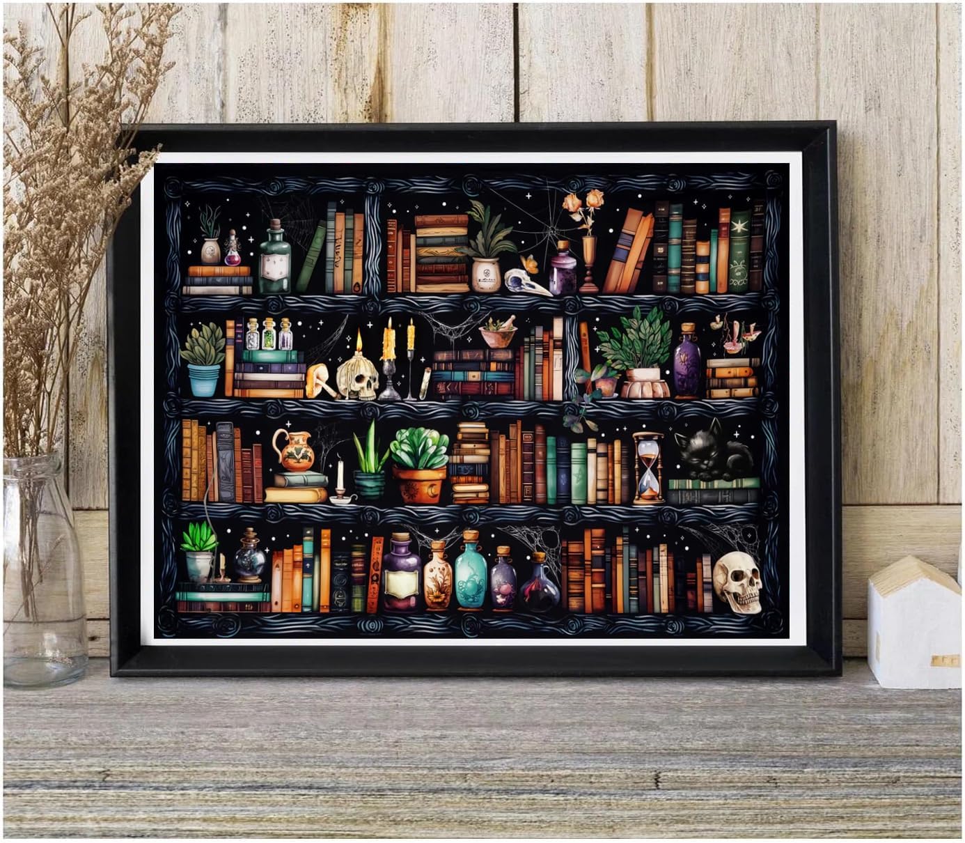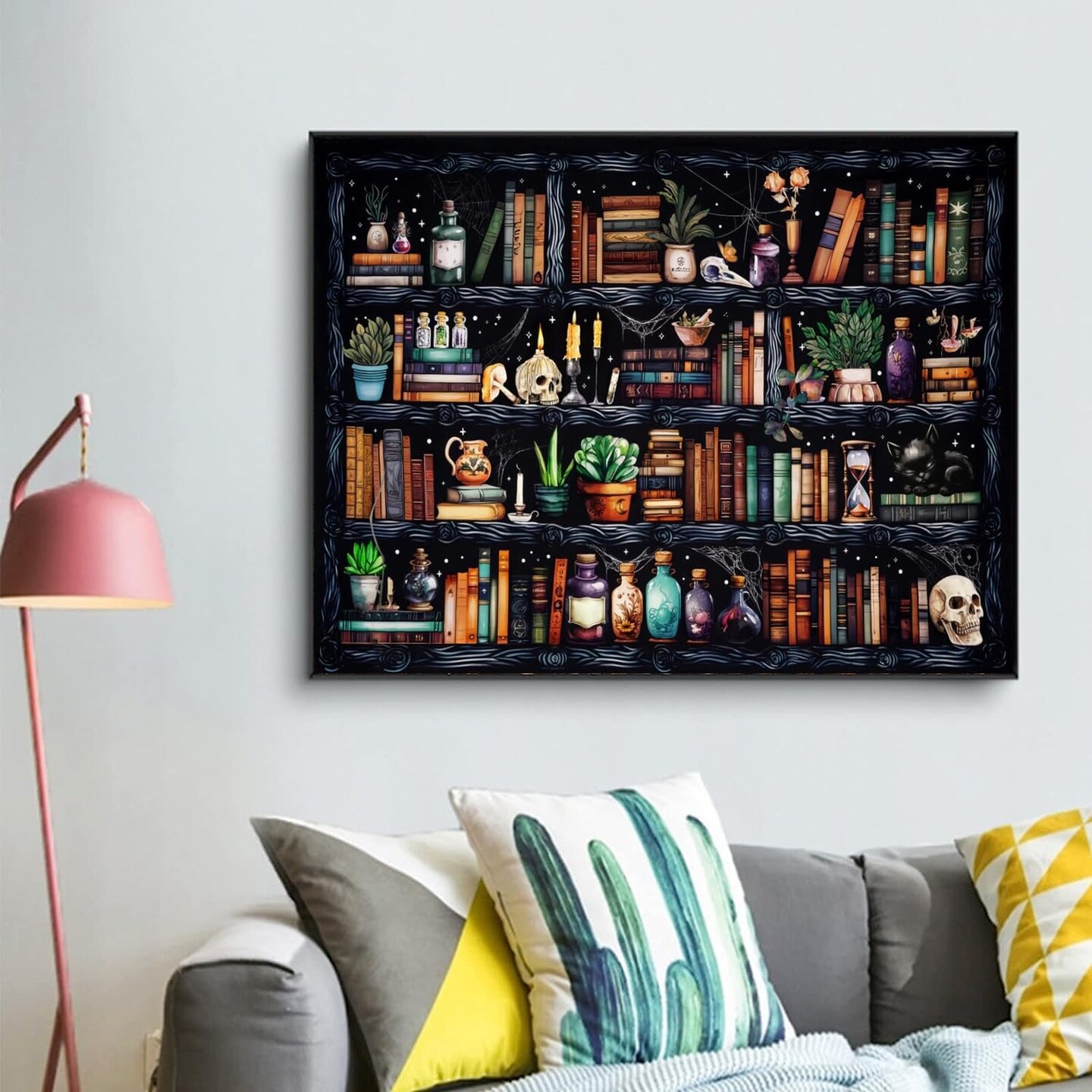 Bookshelf Diamond Painting Kit Gothic Skull & Vintage Botanical 12x16in Full Drill 5D Wall Art