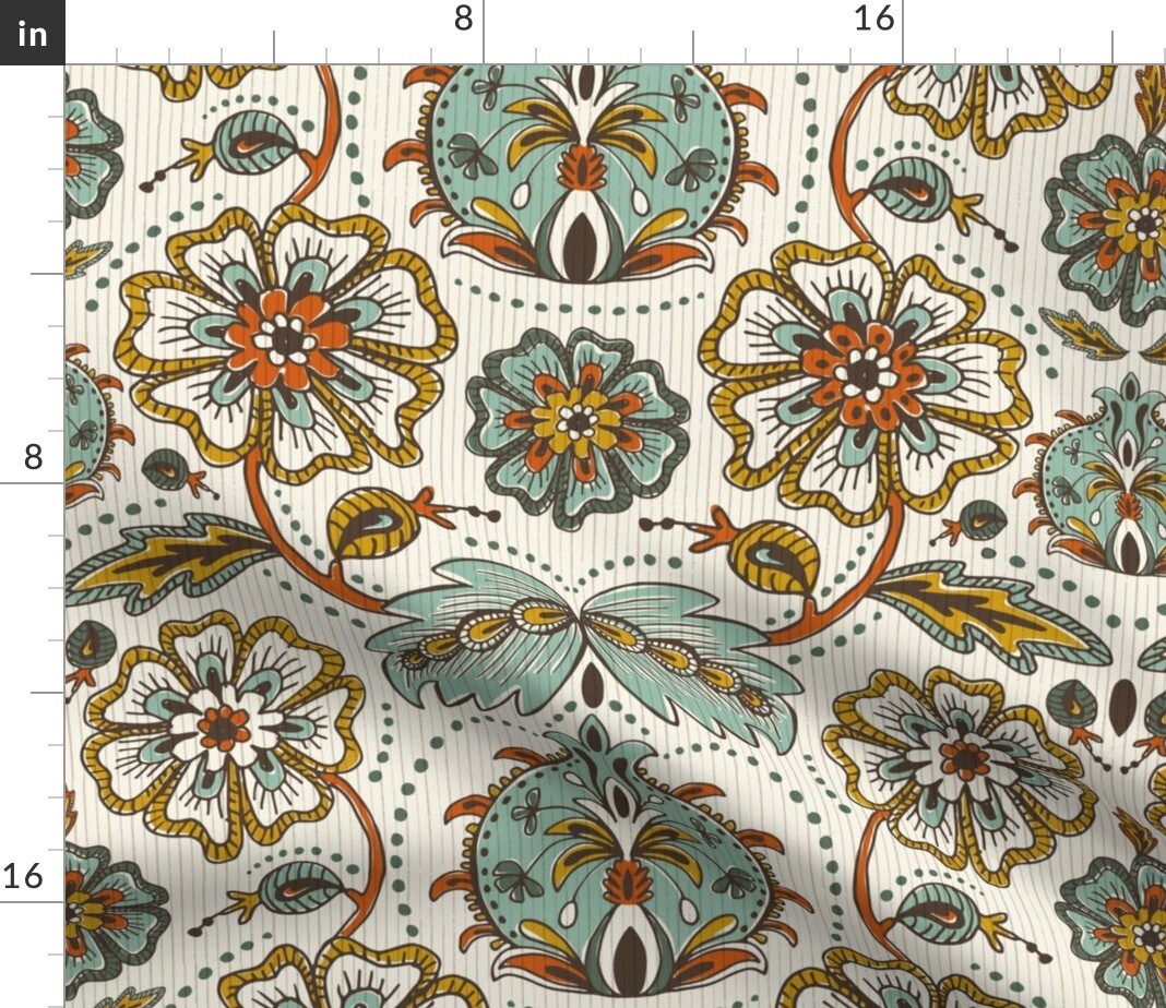 Botanical Damask Ivory Mint Mustard Gold Ornate Bohemian Boho Refined Floral Moroccan Hand Drawn Custom Printed Fabric by Spoonflower Various Fabrics by the Yard or Fat Quarter