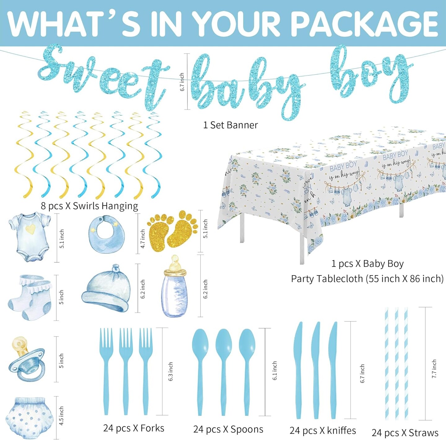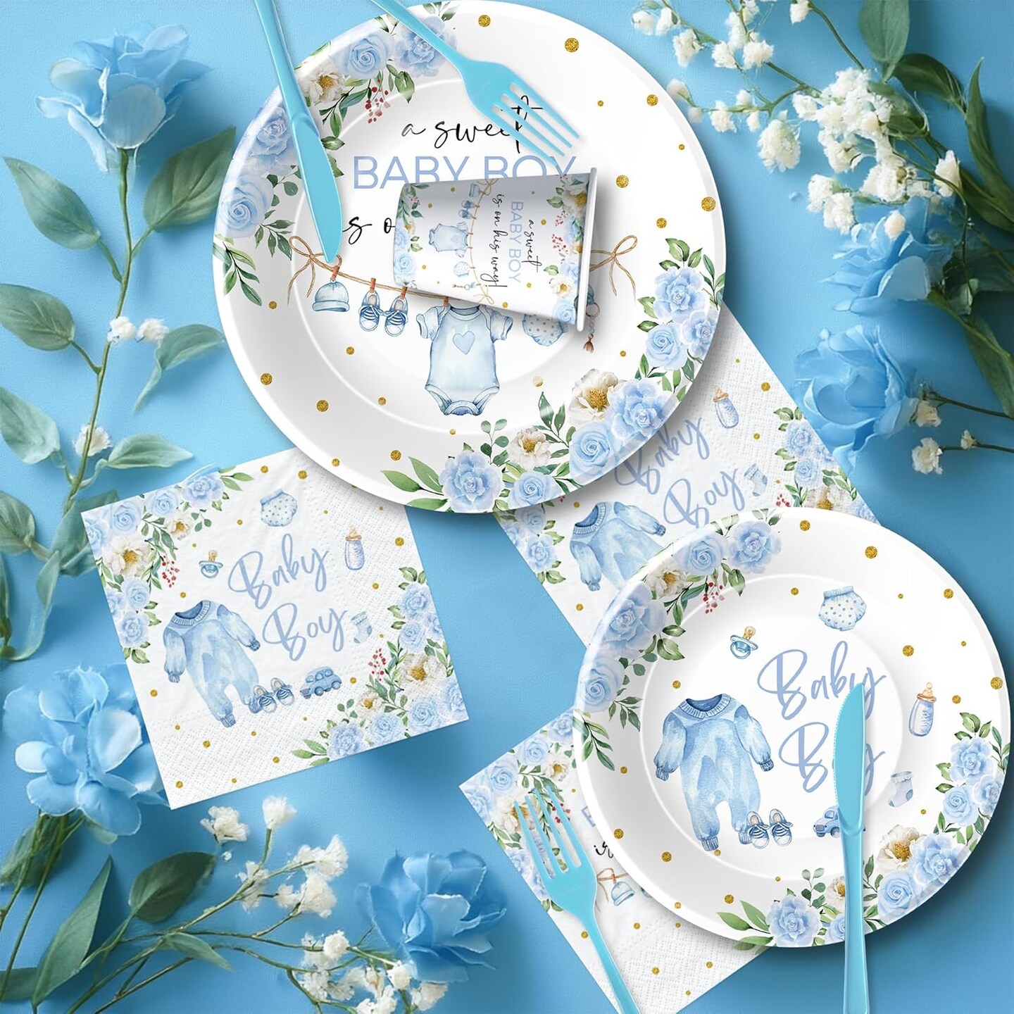 Boy Blue Floral Baby Shower Decorations & Tableware Set – Serves 24 Guests (Blue)