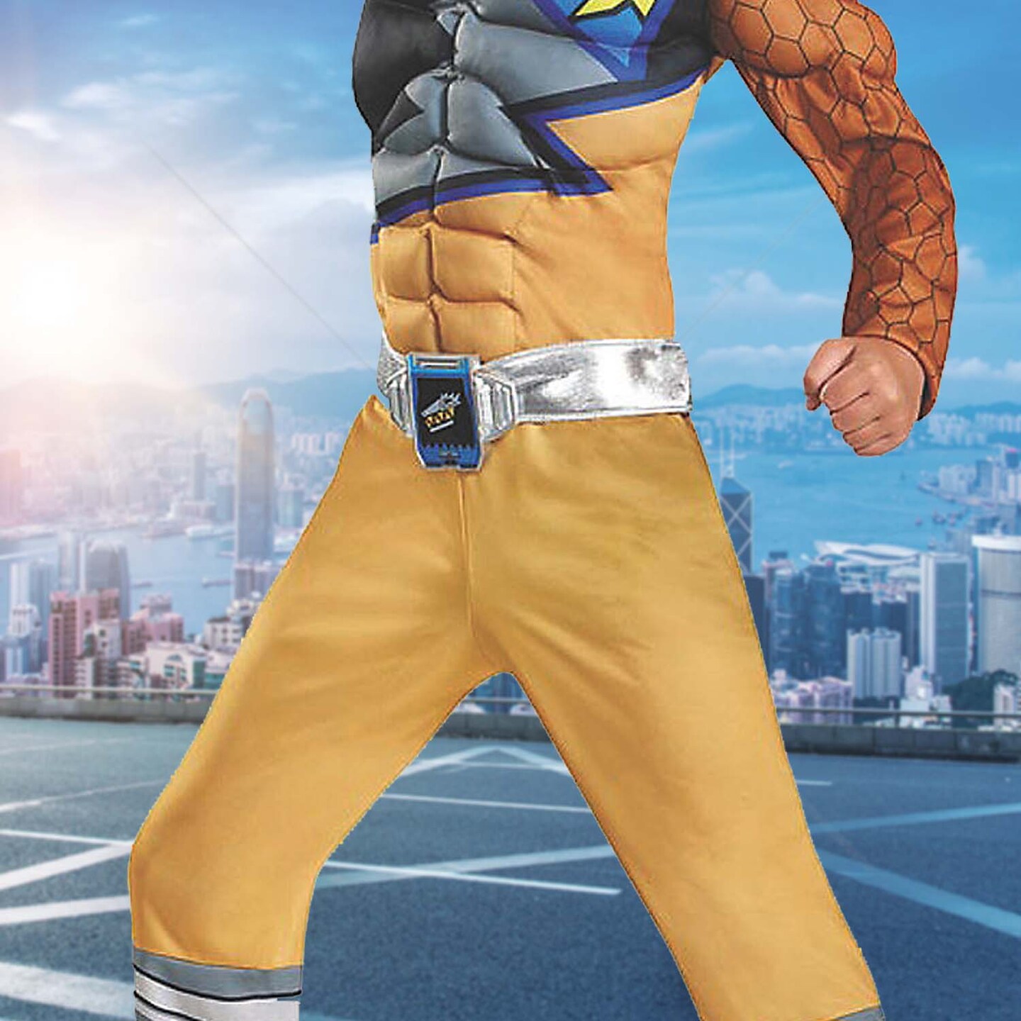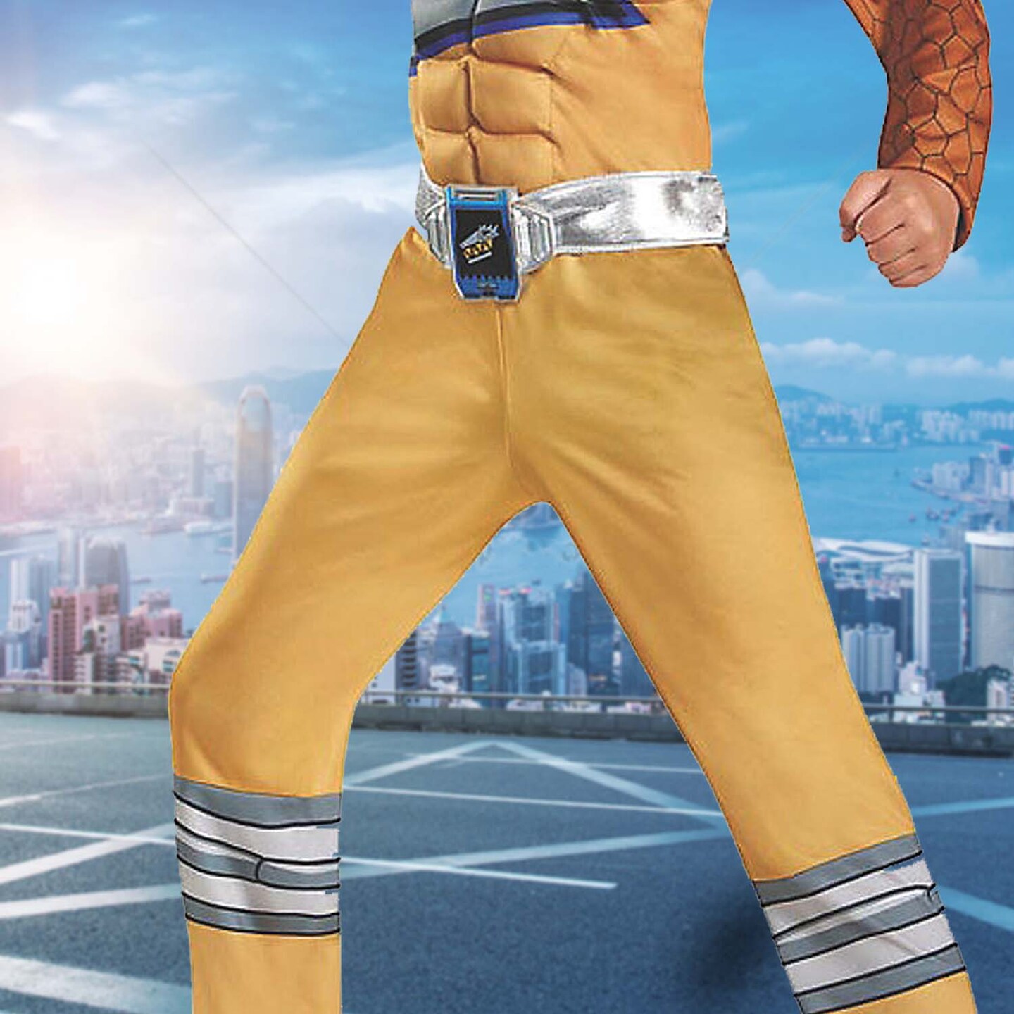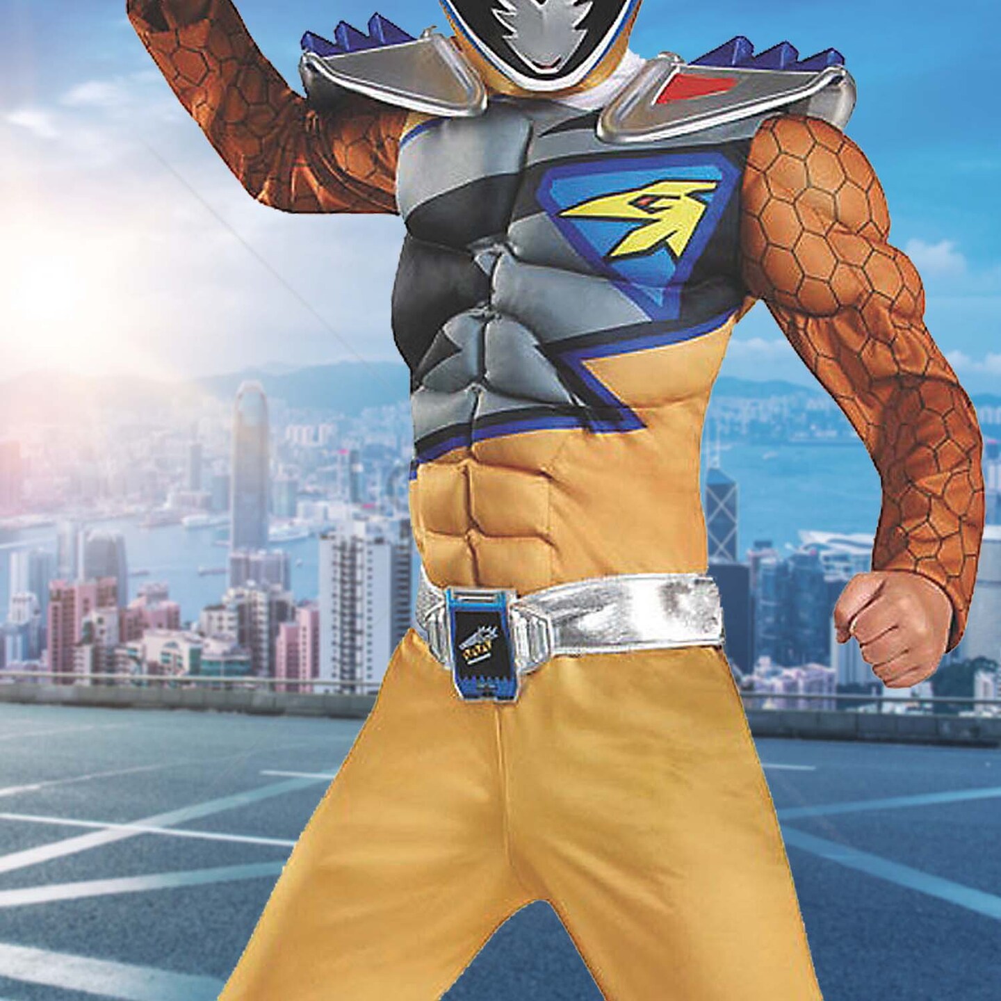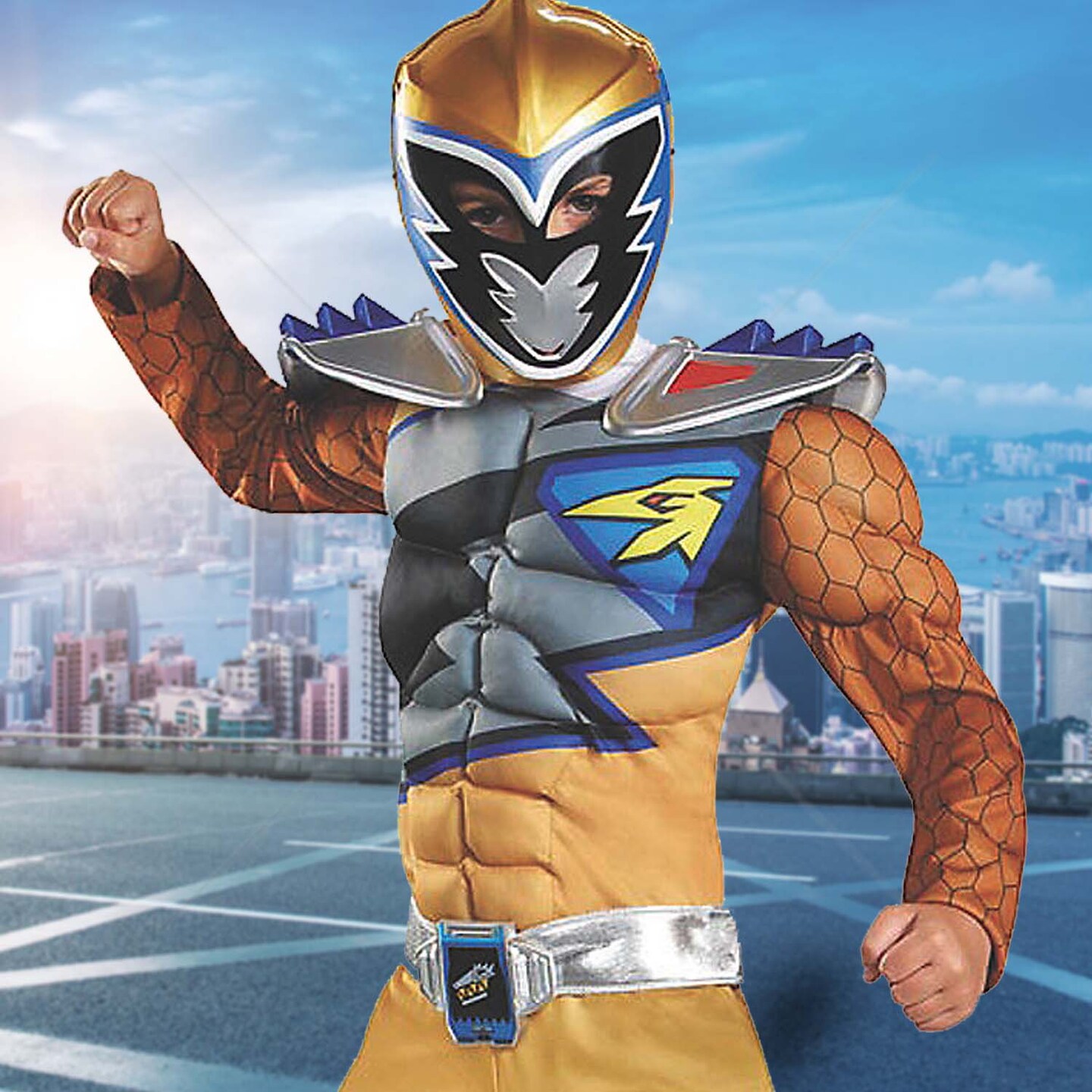 Boys Deluxe Gold Power Rangers Dino Charge Muscle Costume Jumpsuit with Mask and Belt