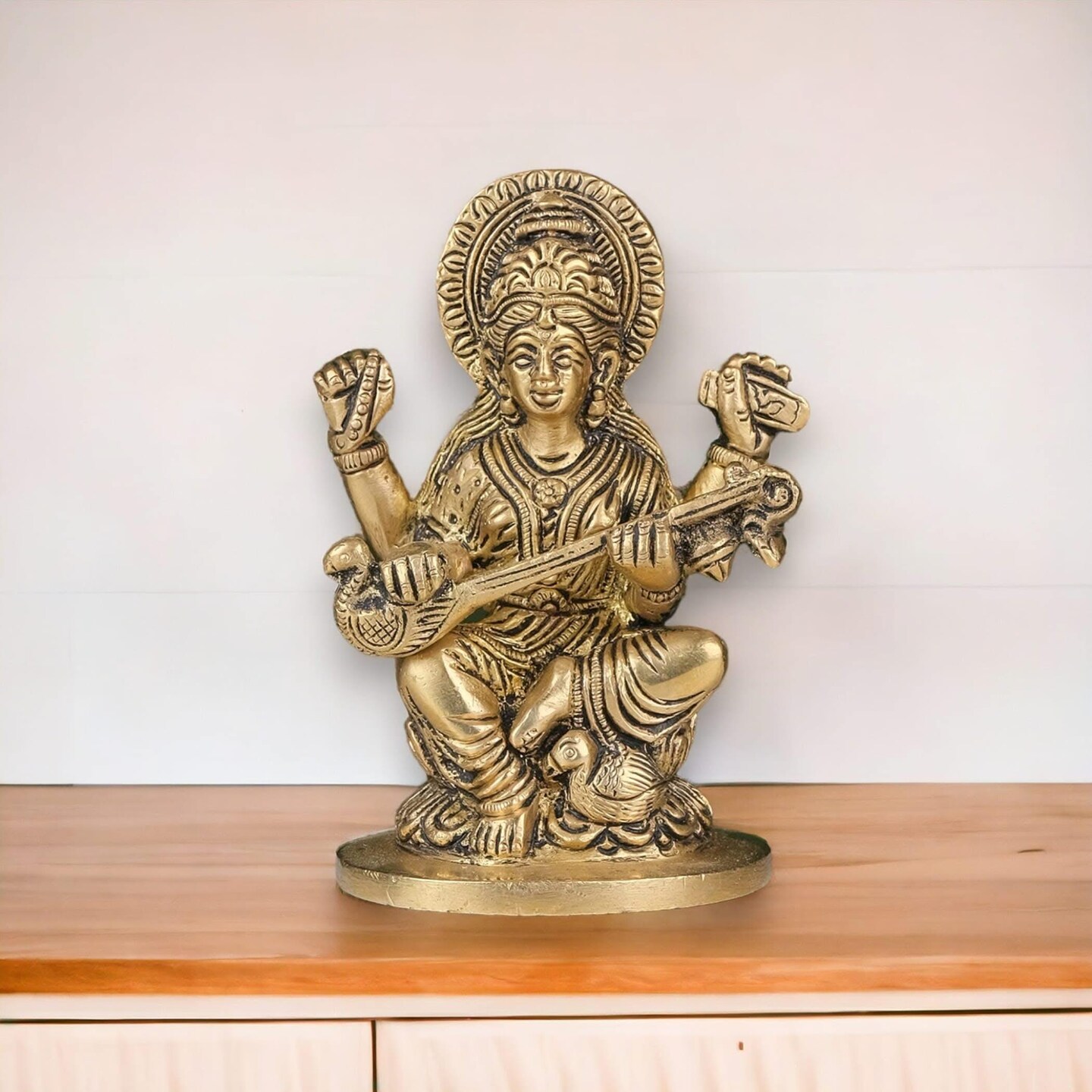 Brass Saraswati Statue Hindu Goddess of Knowledge Religious Beautiful Sitting on Lotus Saraswati Idol Sculpture for Basant Panchmi Home Temple Mandir Decor - Teacher’s Day Gift