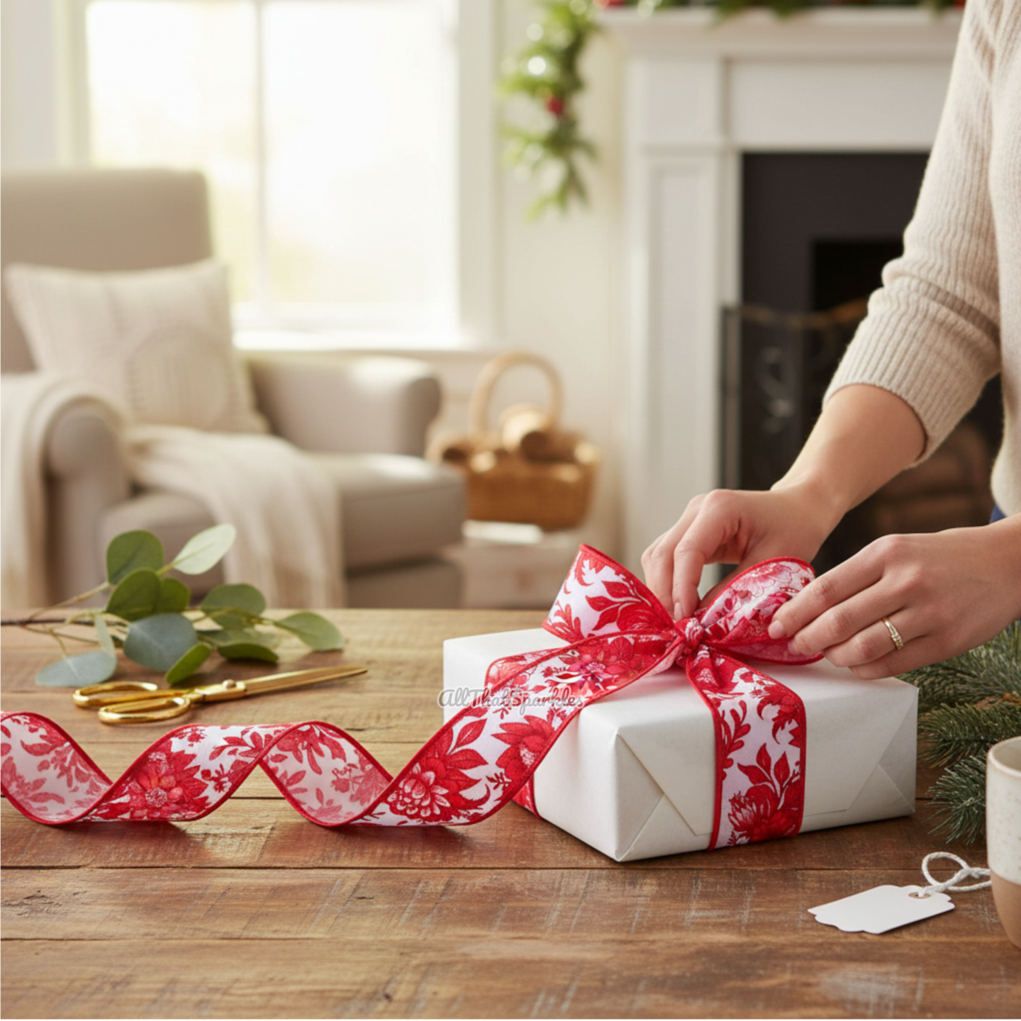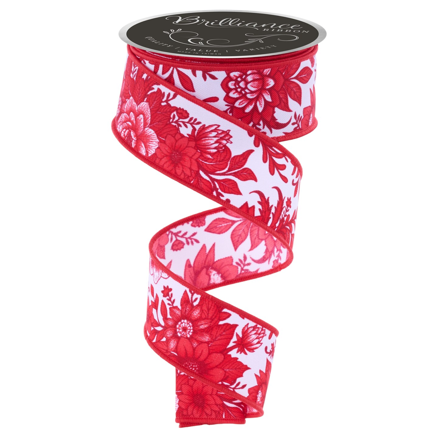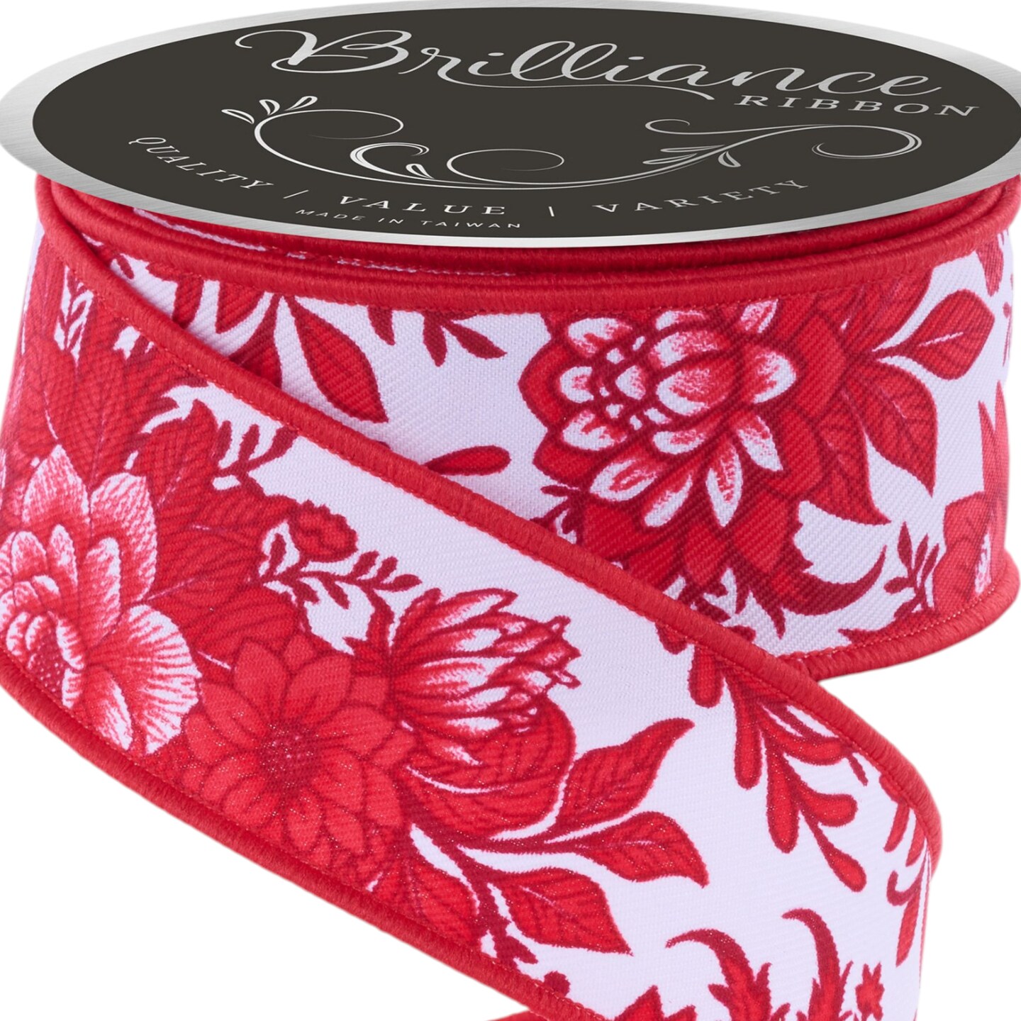Brilliance 1.5" Chinoiserie Florals Wired Ribbon for Flower Pattern Bows, Wreaths, Gift Wrap, Crafts and Decorations (White, Red, 10 Yards)