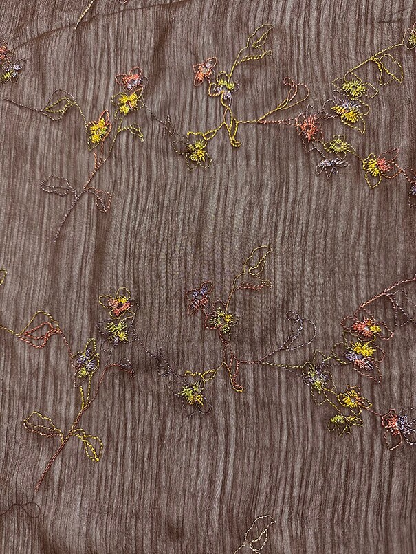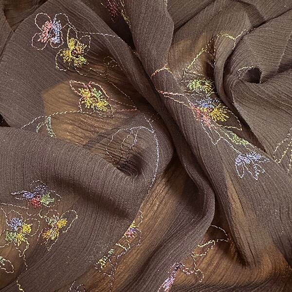 Brown Embroidered Floral Crinkled Poly Chiffon Fabric By the Yard