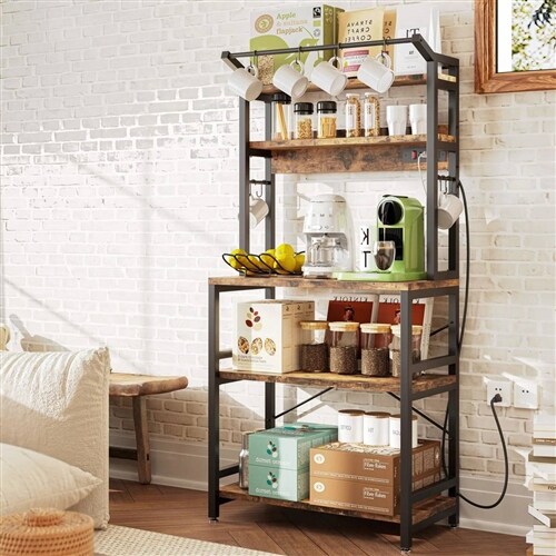 Brown Iron-Wooden Baker’s Rack with 3 Storage Shelves and Microwave Stand for Kitchen or Office