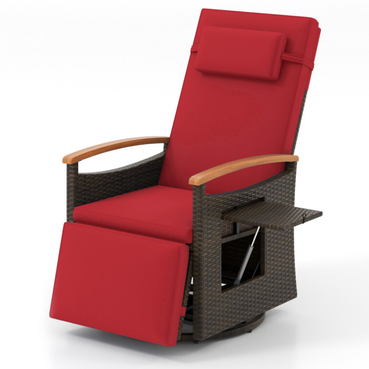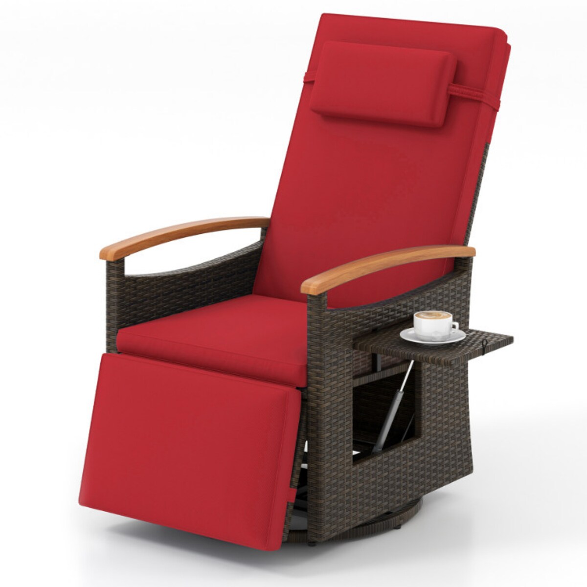 Brown Rattan Swivel Recliner Chair with Adjustable Backrest, Cushion and Foldable Side Table