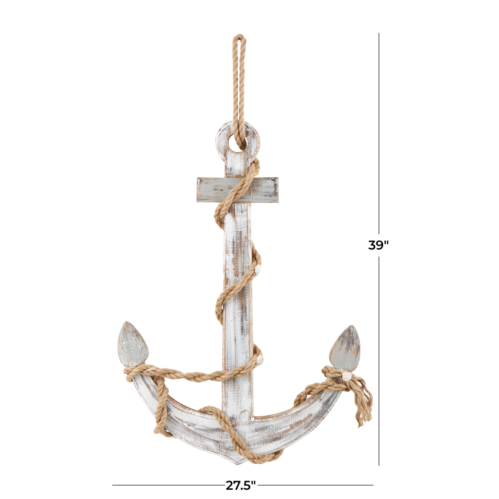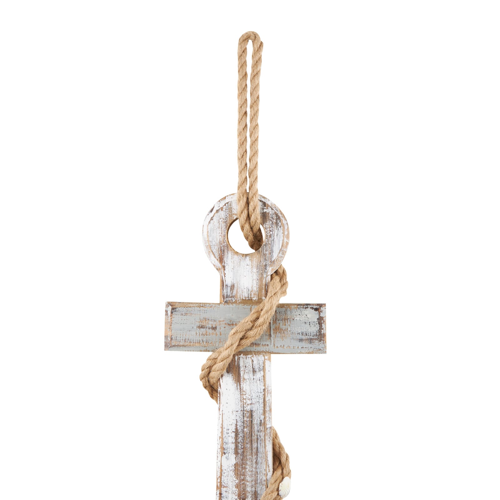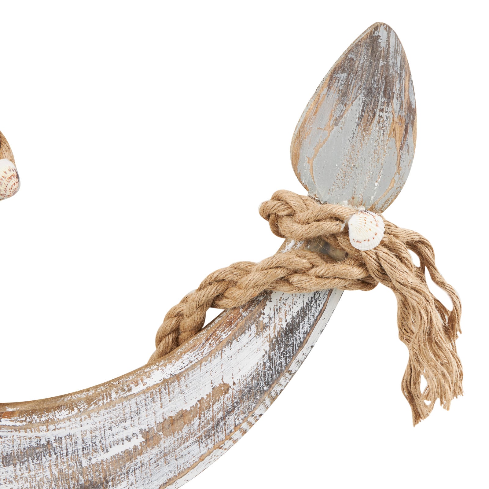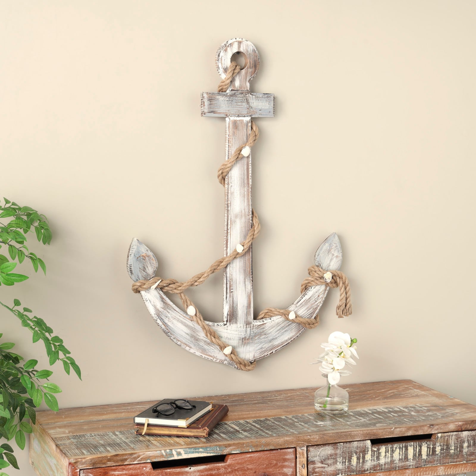 Brown wood anchor handmade wall décor with rope and shell accents.