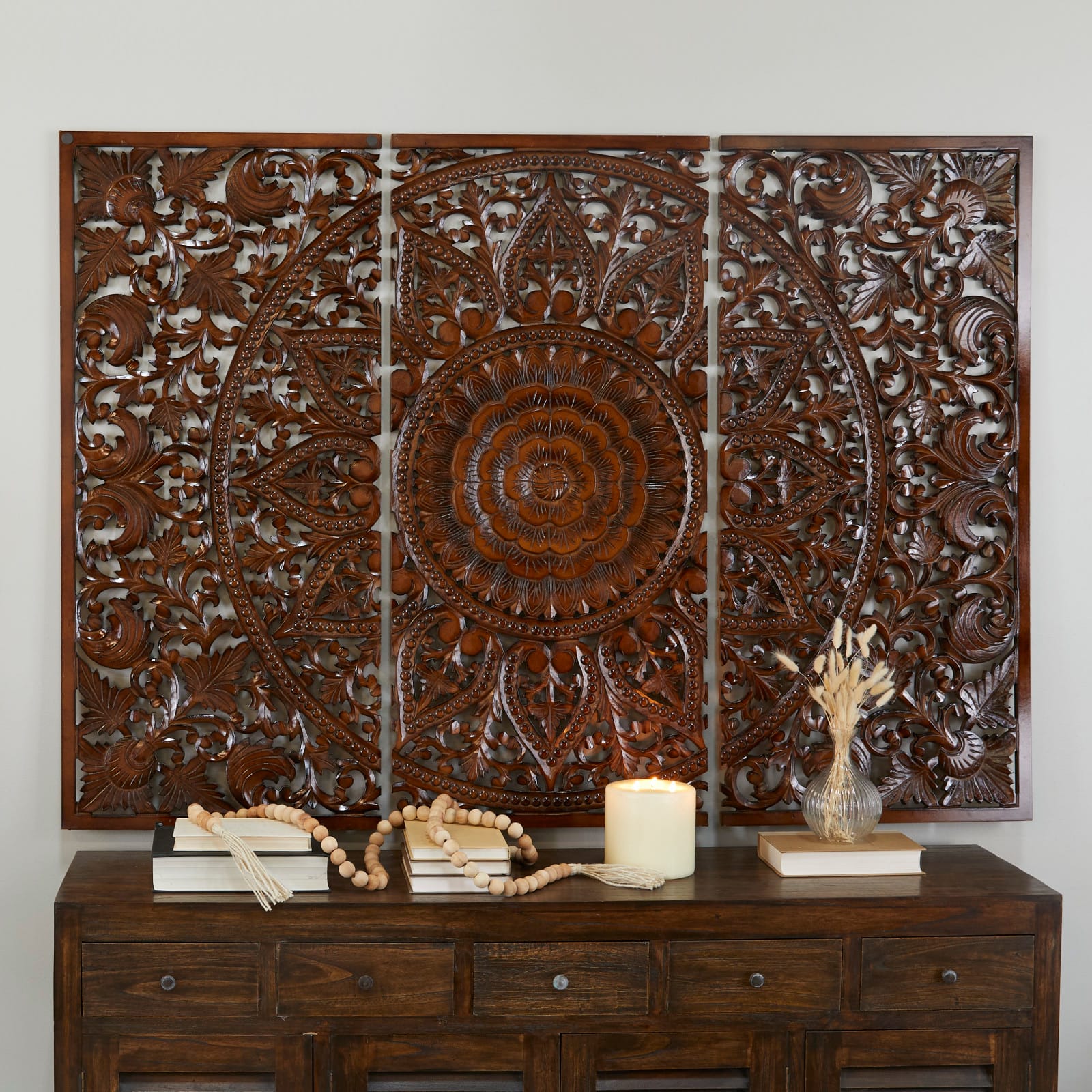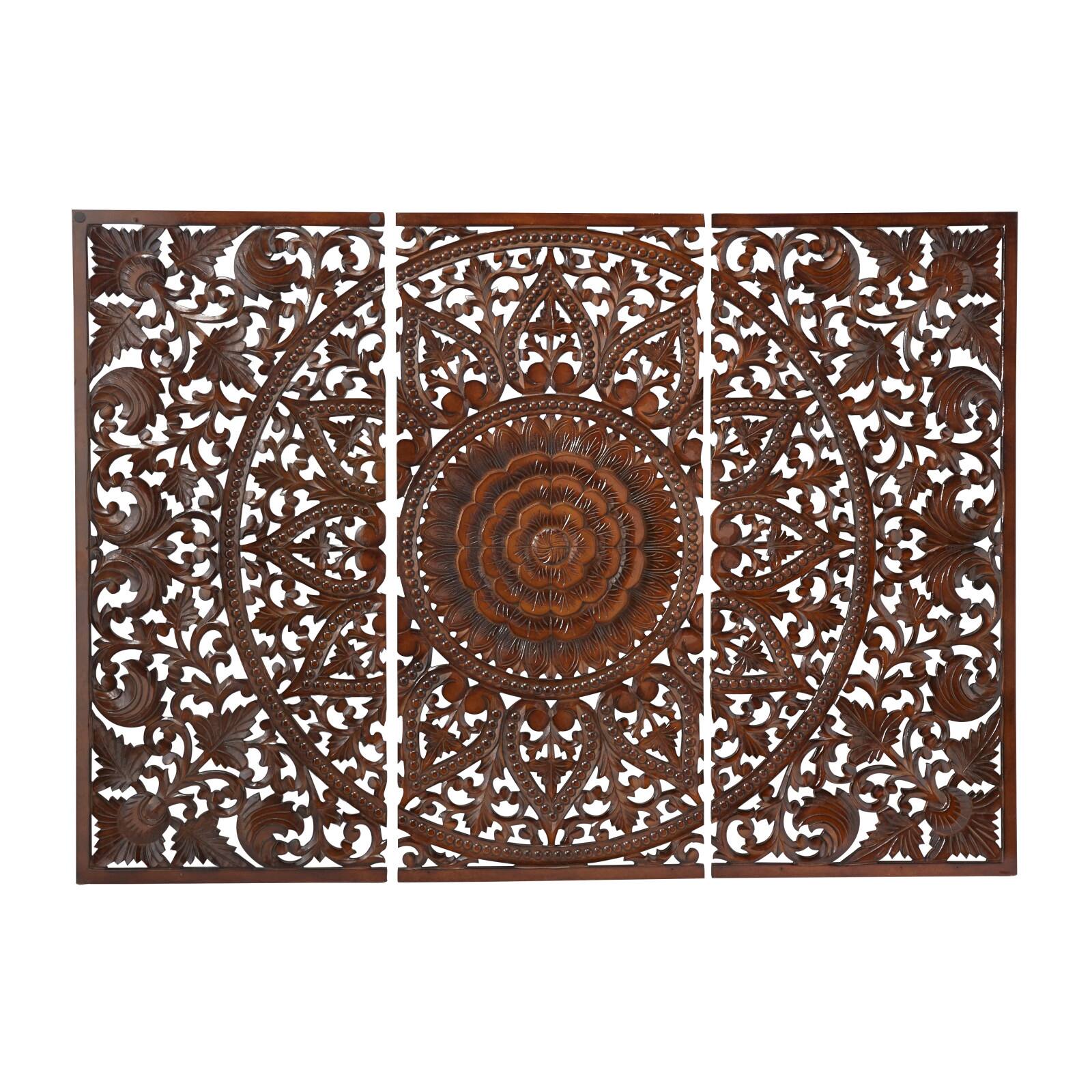 Brown Wood Handmade Intricately Carved Floral Wall Decor with Mandala Design Set of 3 22", 48"