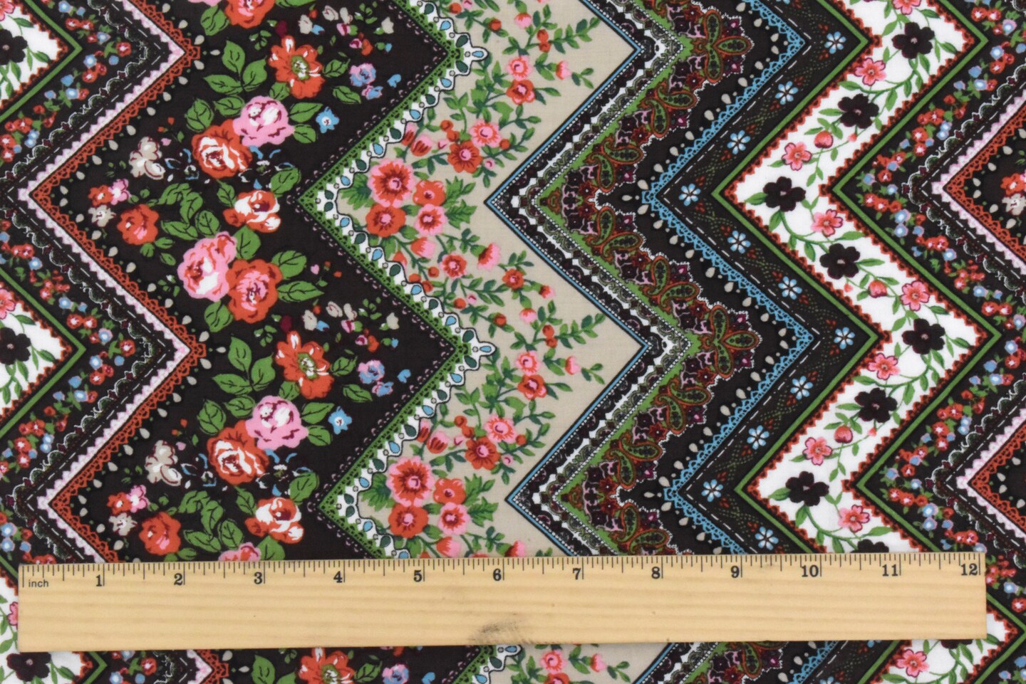 Brown-Green-Multi Chevron Floral Printed Woven Fabric By the Yard