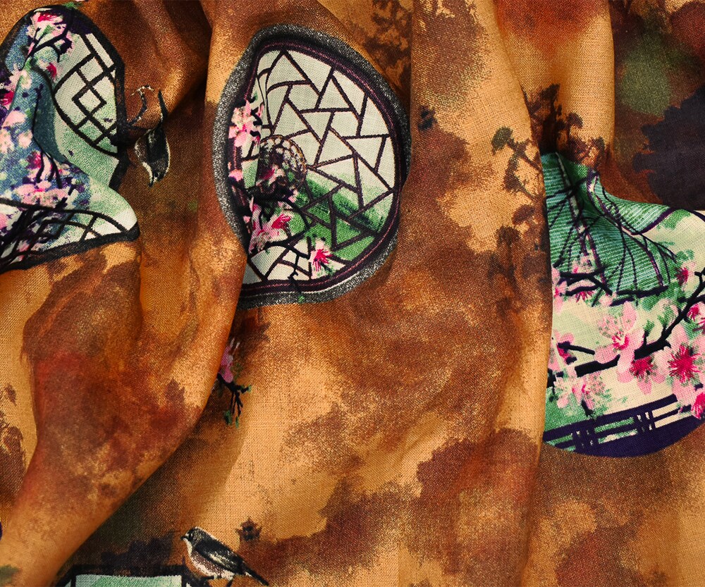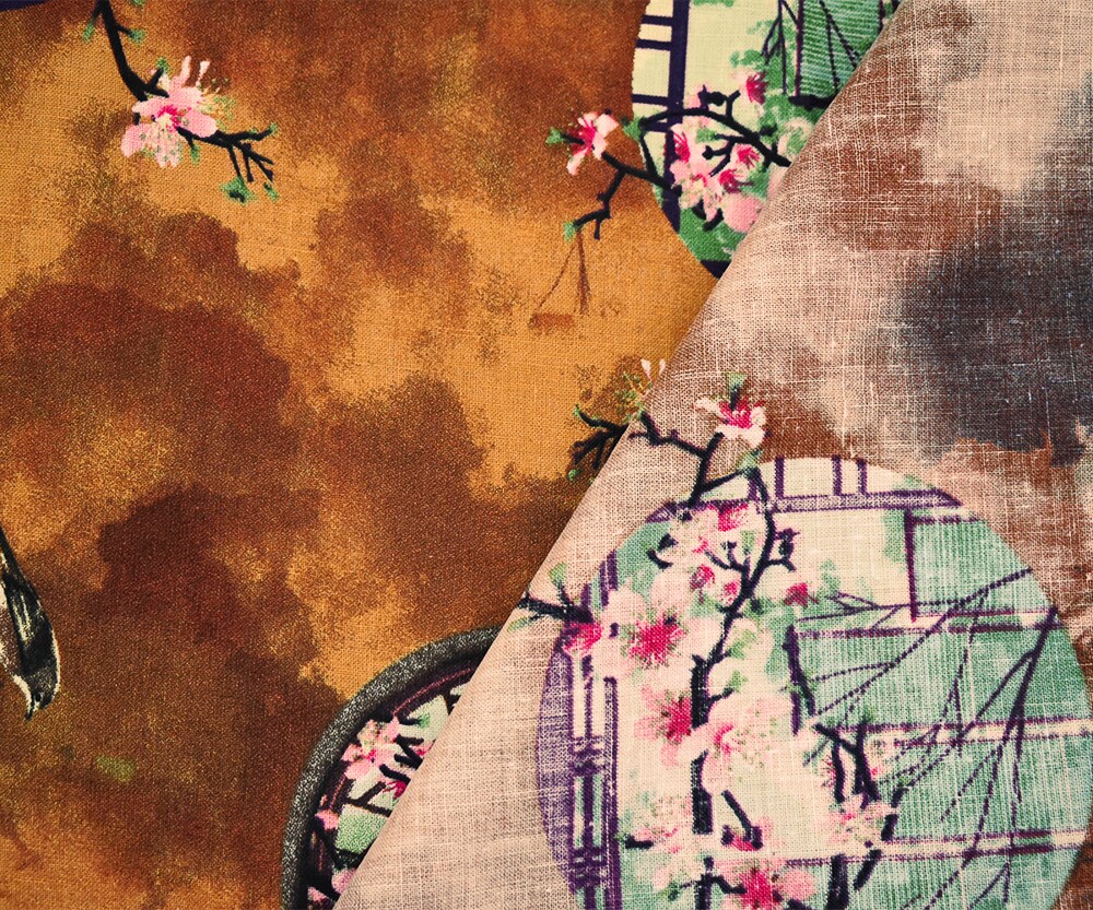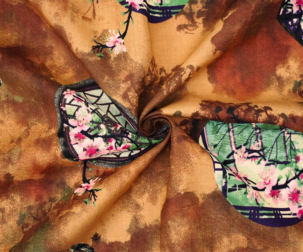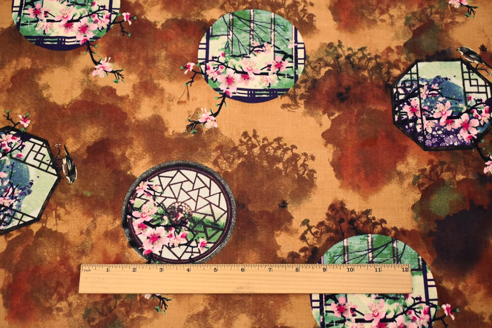Brown-Mint Green-Multi Cherry Blossom Window Printed Linen Woven Fabric By the Yard