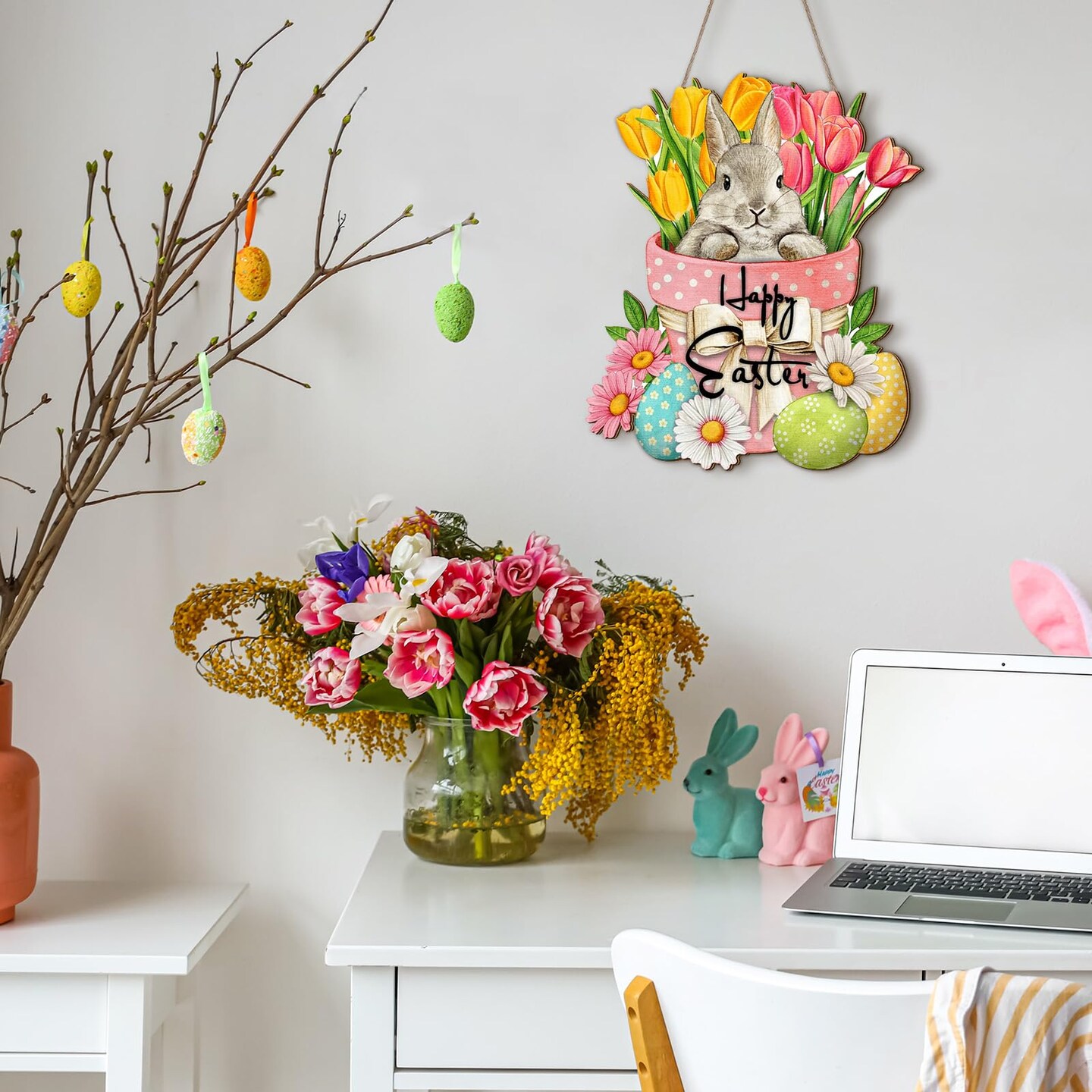 Bucherry Happy Easter Door Sign Plaque Easter Egg Rabbit Wooden Hanging Door Sign Decorations Easter Floral Spring Wall Hanger Rustic Farmhouse Easter Decor for Easter Spring Party Indoor Outdoor Home