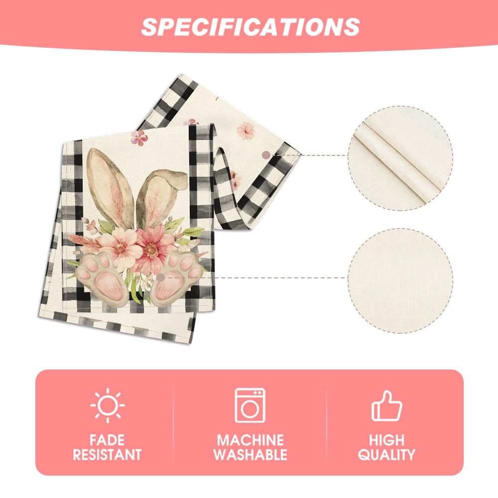 Buffalo Plaid Bunny Ear Foot Flower Easter Table Runner, Seasonal Spring Kitchen Dining Table Decoration for Home Party Decor 13x72 Inch