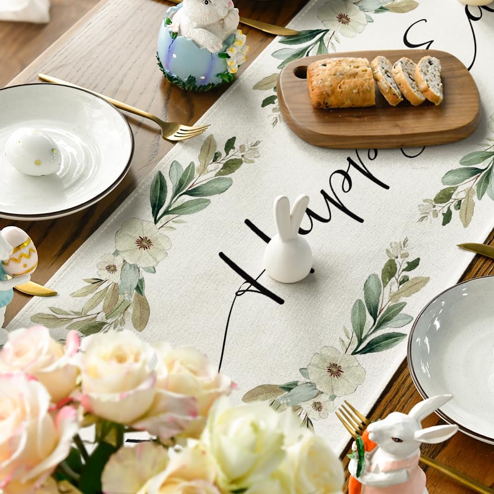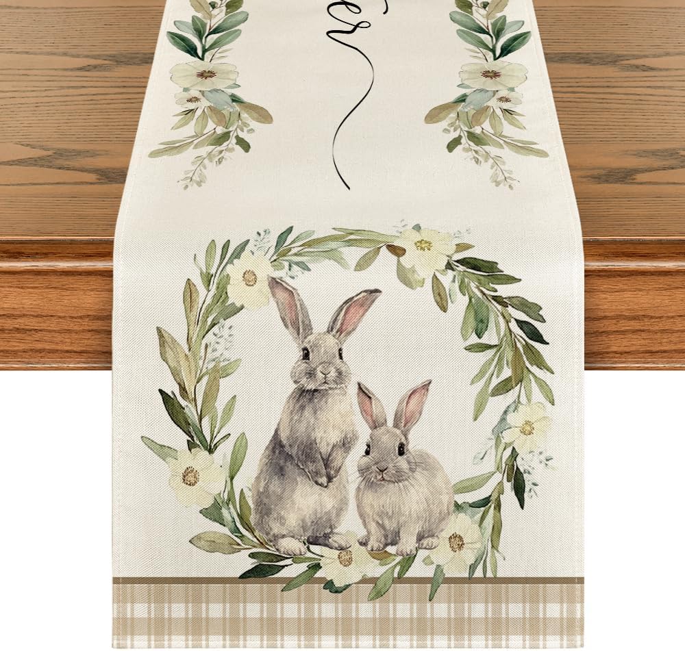 Buffalo plaid bunny rabbit, wild flowers Easter table runner, 13x72 inches.