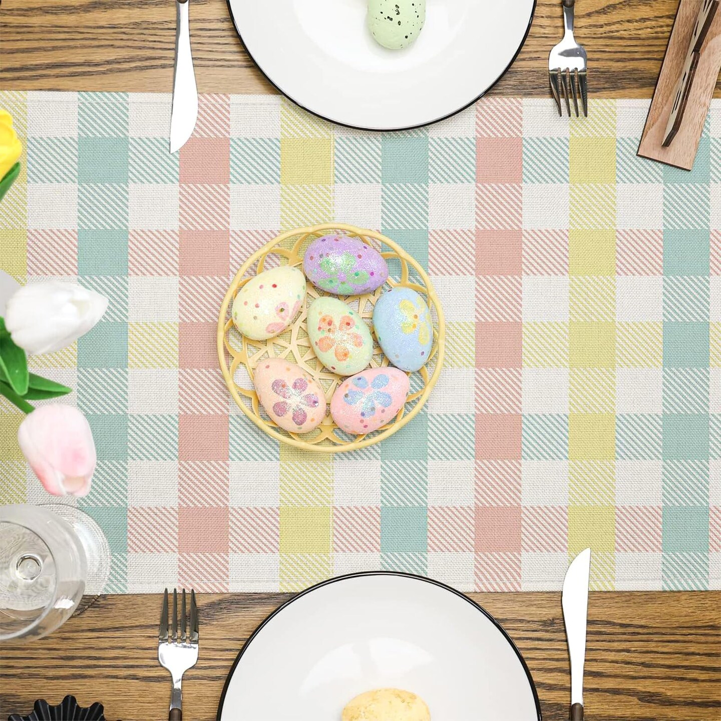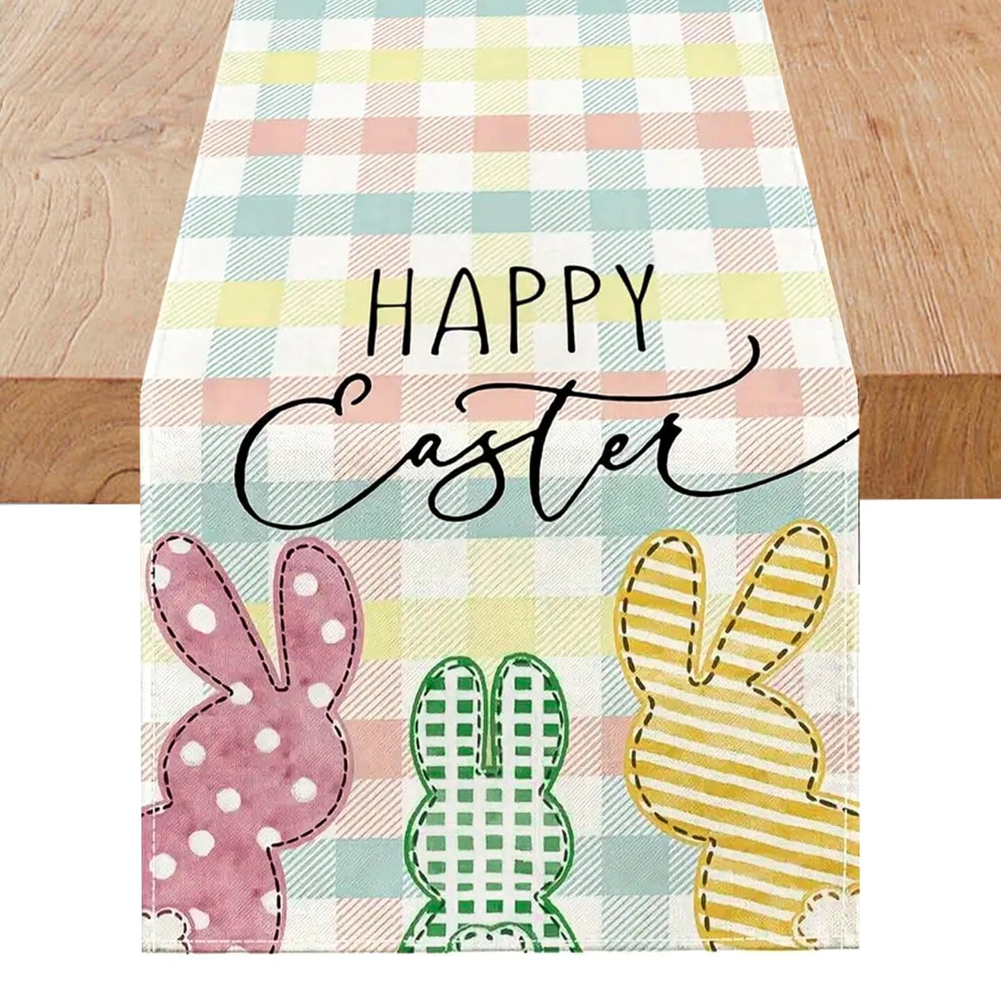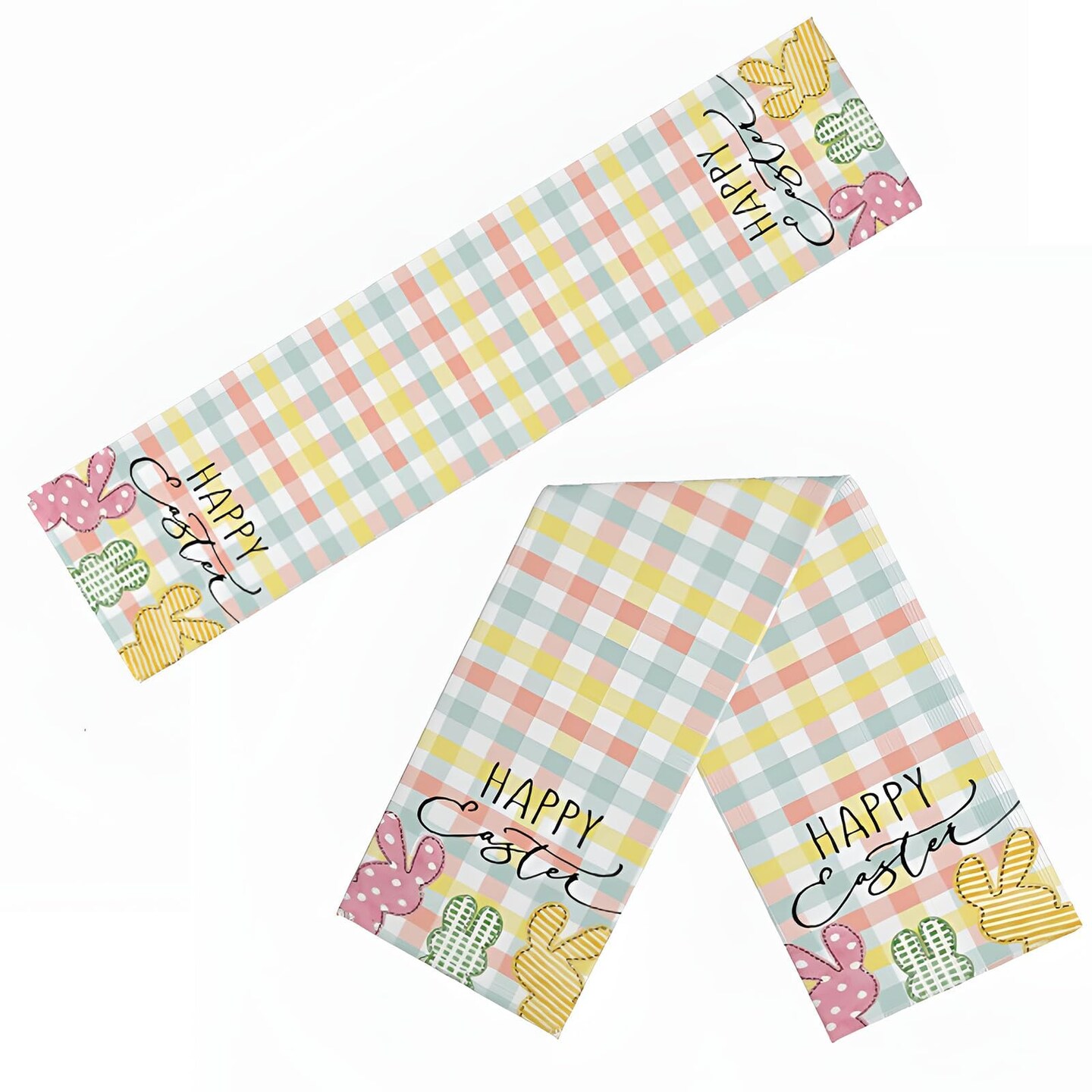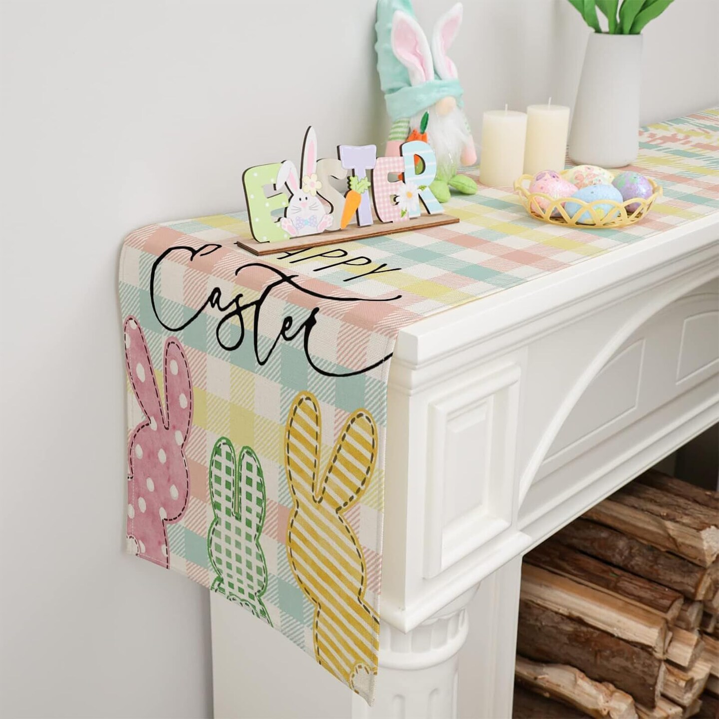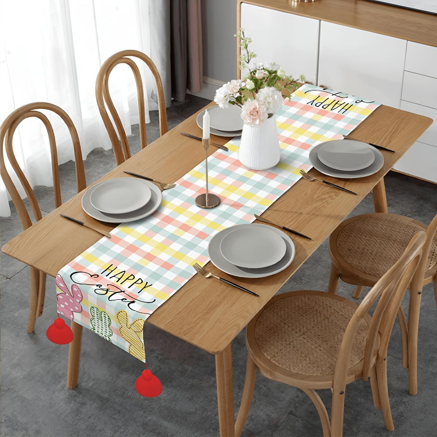 Buffalo Plaid Rabbit Bunny Happy Easter Table Runner, Easter Decorations, 13x72 Inch Check Stripes Kitchen Table Decor, Spring Kitchen Dining Table Decoration for Home Party Decor