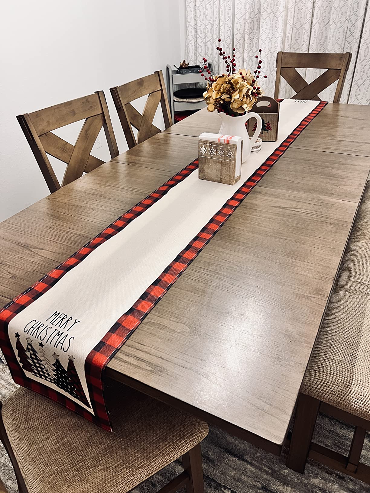 Buffalo Plaid Table Runner Christmas Trees Merry Xmas Table Runner Winter Holiday Kitchen Dining Table Decoration, Black and Red