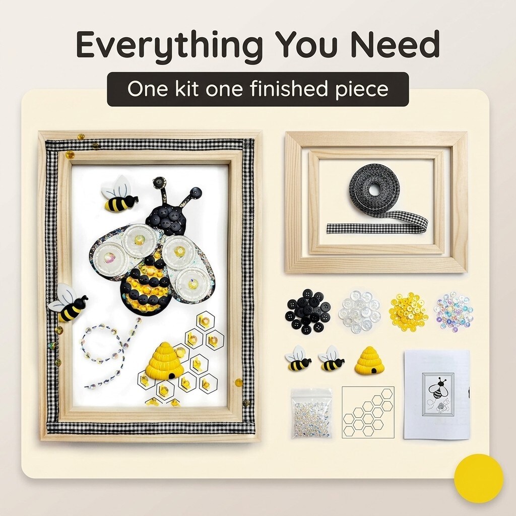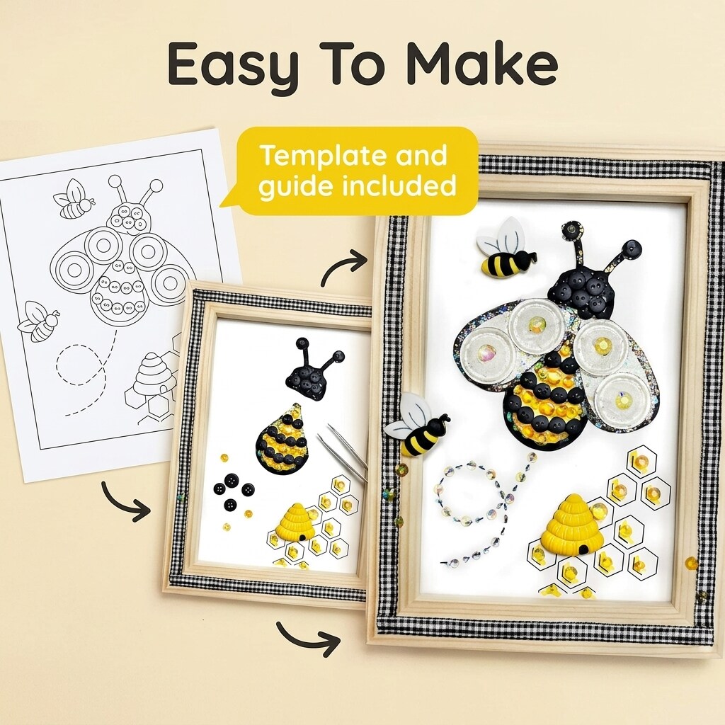 Bumble Bee Button Art Frame Kit, Honeycomb Design, Gingham Trim by Buttons Galore