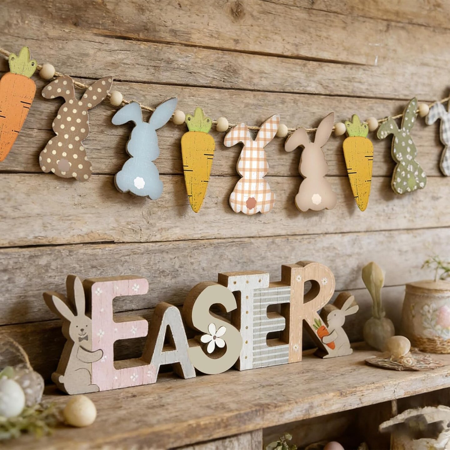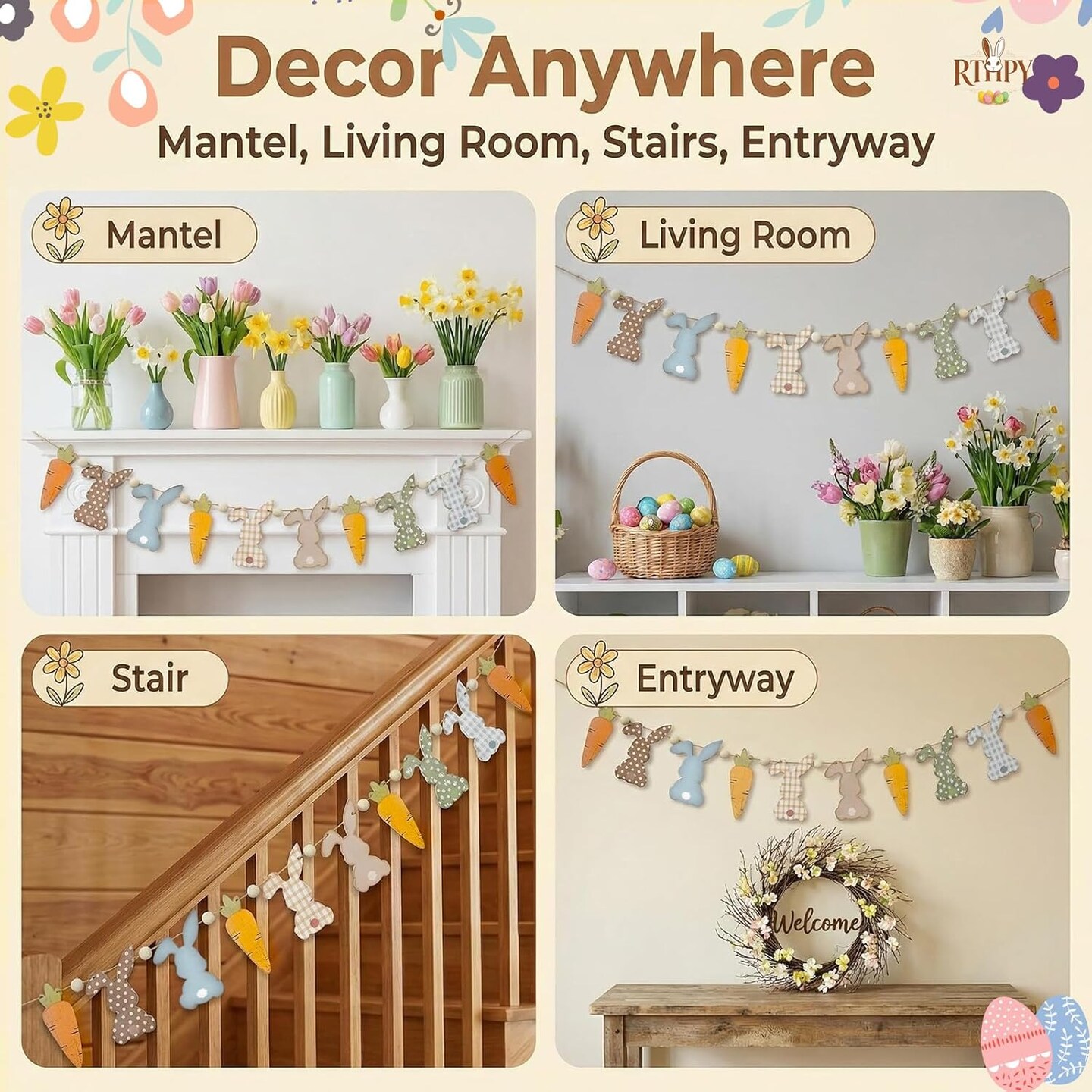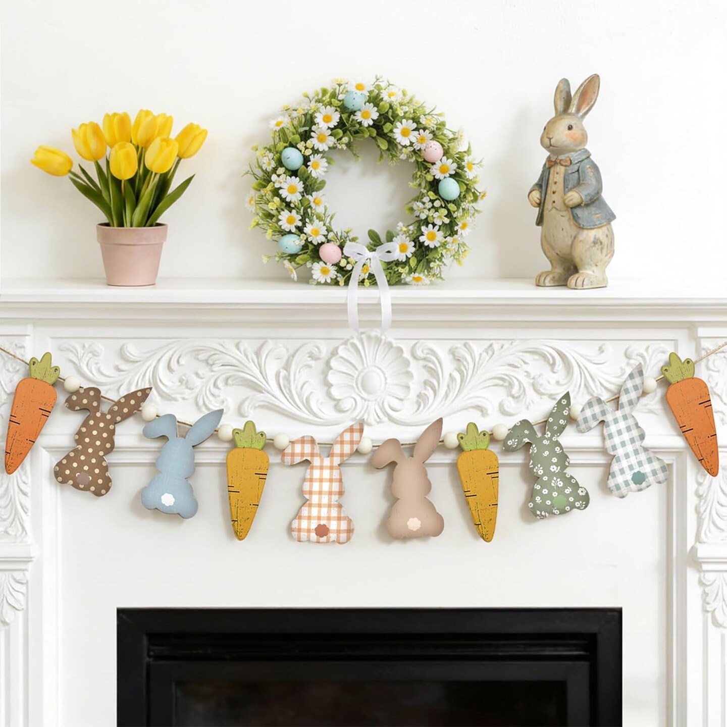 Bunny & Carrot Easter Garland – Wooden Beads Banner for Mantel, Fireplace, Wall & Spring Farmhouse Decorations
