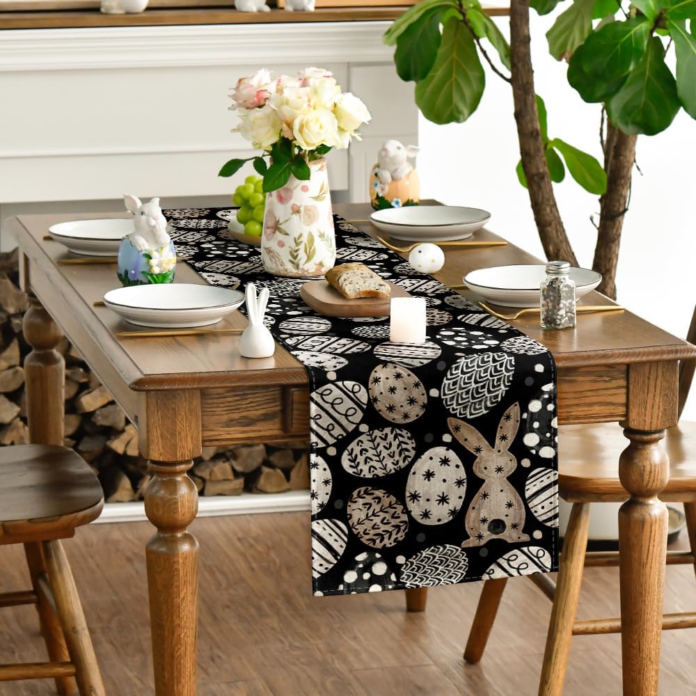 Bunny rabbit, eggs, flowers Easter table runner, 13x72 inches, spring kitchen dining decor.
