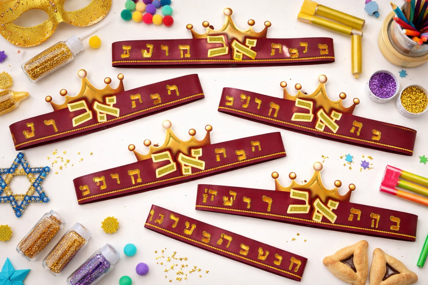 Burgundy Aleph Bet Glitter Crowns – Hebrew Alphabet Crowns for Purim, Classroom & Jewish Crafts (20 Pack)